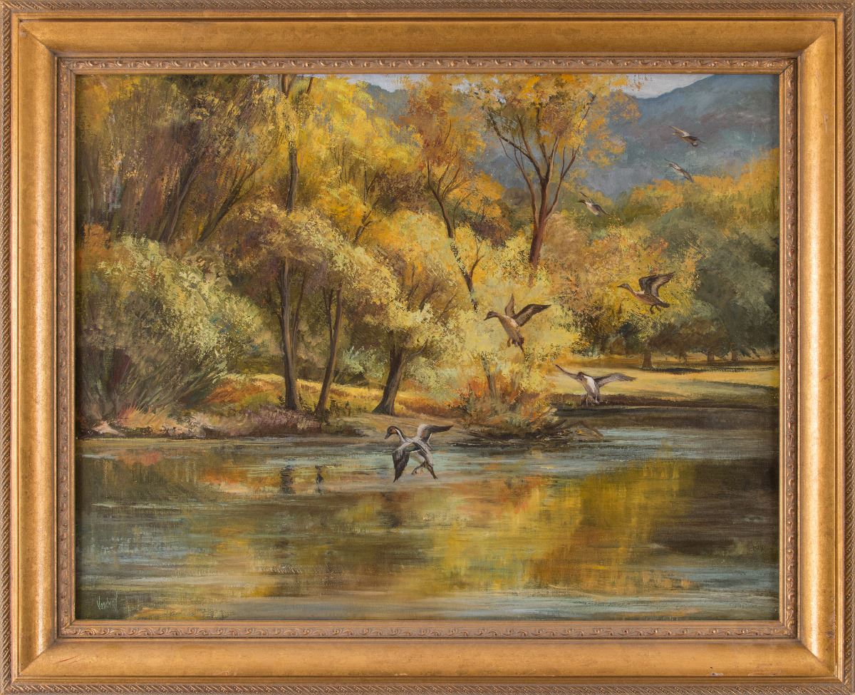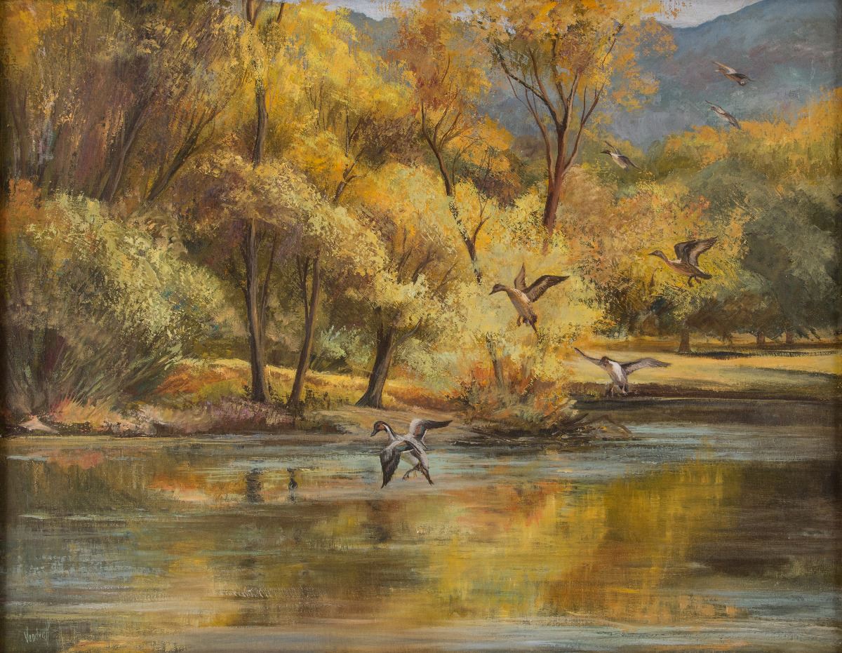 Olive Vandruff (1908-2003). Ducks Over Marsh. 26" x 28" oil on canvas. Signed lower left.