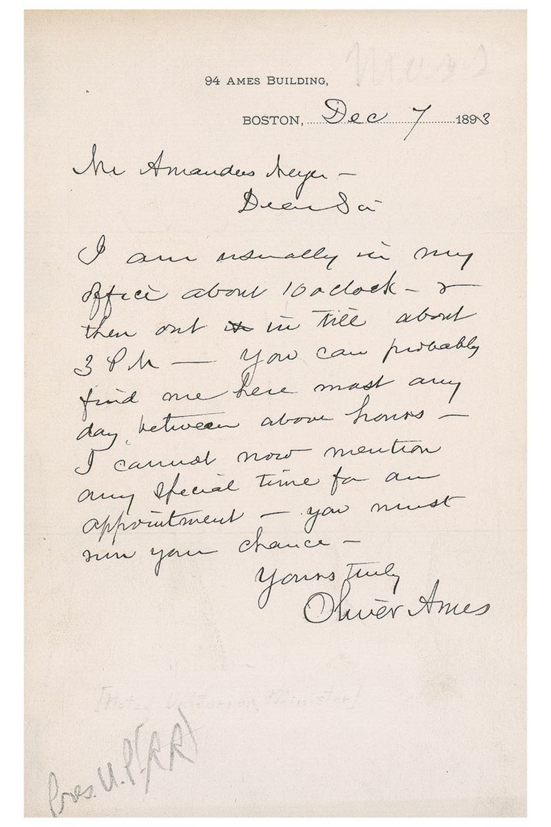 ALS, one page, 5 x 8, Ames Building letterhead, December 7, 1893. “I am usually in my office about 10 o’clock—& then out in till probably 3pm—You can find me here most any day between above hours—I cannot now mention any special time for an appointment—you must run your chance—.”Affixed to an 8.5 x 11 album sheet. In fine condition, with toning around the edges and several pencil notations in another hand.