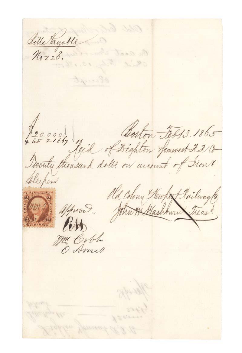 OLIVER AMES (1831-1895) U.S. political figure who served as Governor of Massachusetts. Manuscript doucment Signed, "O Ames." One page, 5" x 8". Boston. February 3, 1865. The document acknowledges reciept of twenty thousand dollars on account of Iron Sleeper. Revenue stamp affixed at left. Fine.