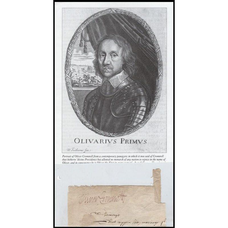 This fantastic autograph comes with two reproduction engravings depicting Oliver Cromwell.