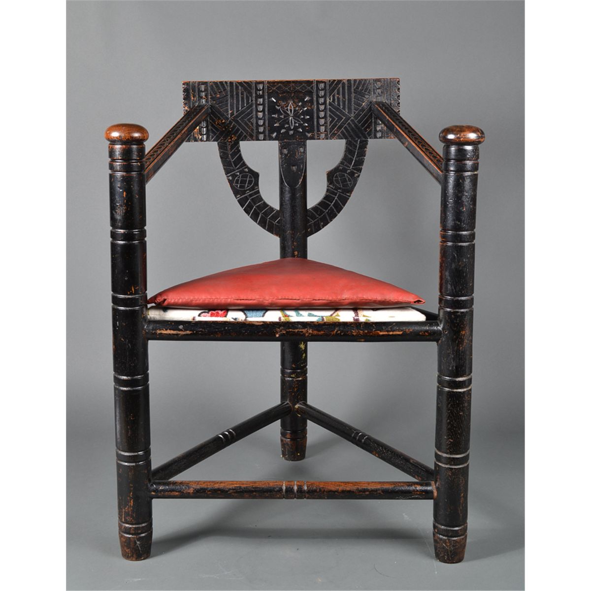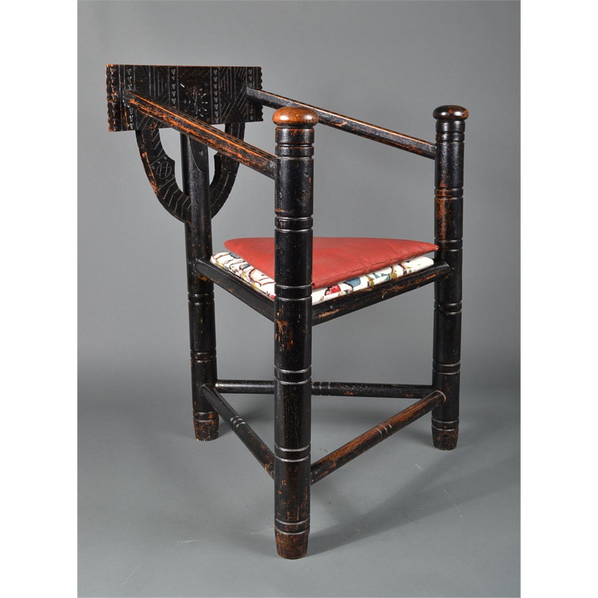 With ebonized wood finish, carved in the 17th century style with post handles, carved backsplash, and turned stretcher. 32.5" H x 24.5" W x 20.5" D, circa late 19th century. Private collection Shelby Twp., MI.