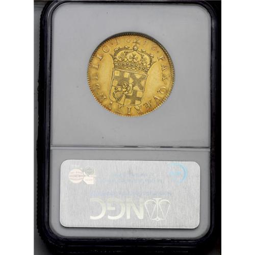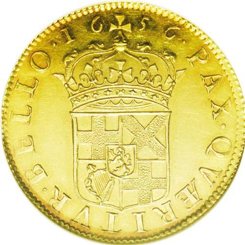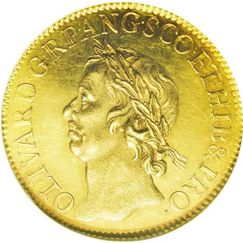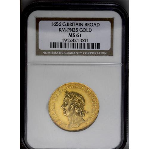 <B>Oliver Cromwell gold Pattern Broad 1656,</B></I> WR-39, KM-PN25, MS61 NGC. Well struck with greenish-gold patina and prooflike fields with rather numerous hairlines. A very popular and rare issue that is called a pattern, but as the rest of the Cromwell issues, may actually have been struck for circulation.