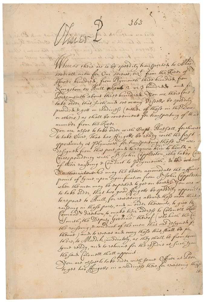 English soldier and statesman (1599–1658) who led Parliamentary forces in the English Civil War, waged war against Scotland and Ireland and, in 1653, following the execution of Charles I, became Lord Protector of Great Britain, a position he held until his death in 1658. After a yearlong reign by his son, Richard, the British throne was restored to Charles II and Cromwell’s body was exhumed and posthumously ‘executed.’ LS in Old English, signed “Oliver P,” one page both sides, 8.25 x 12.5, April 3, 1658. Cromwell, as Lord Protector, gives instructions to send over 1200 men to Worth France (Mardyke) with the frigates required for the transport coming from English ports, including Plymouth. Repaired paper loss to right edge, affecting a few words of text, two horizontal folds, tape reinforcement along hinge, scattered toning and foxing, and slight show-through from writing on reverse, otherwise very good condition.