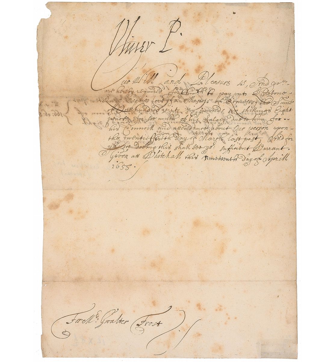 Manuscript DS, signed “Oliver P,” one page, 8 x 11.25, April 19, 1655. In full: “Our will and pleasure is, and governs hereby required…to pay unto Sislobono Long Esquire (and for Masters of Requests) the sum of one hundred sixty six pounds six shillings eight pence, for…much of his salary due to him.” Horizontal storage folds (one passing through text but not affecting signature), moderate overall foxing, show-through from period docketing to reverse, a small repaired cut to the lower right corner, and slightly trimmed edges, otherwise very good condition.