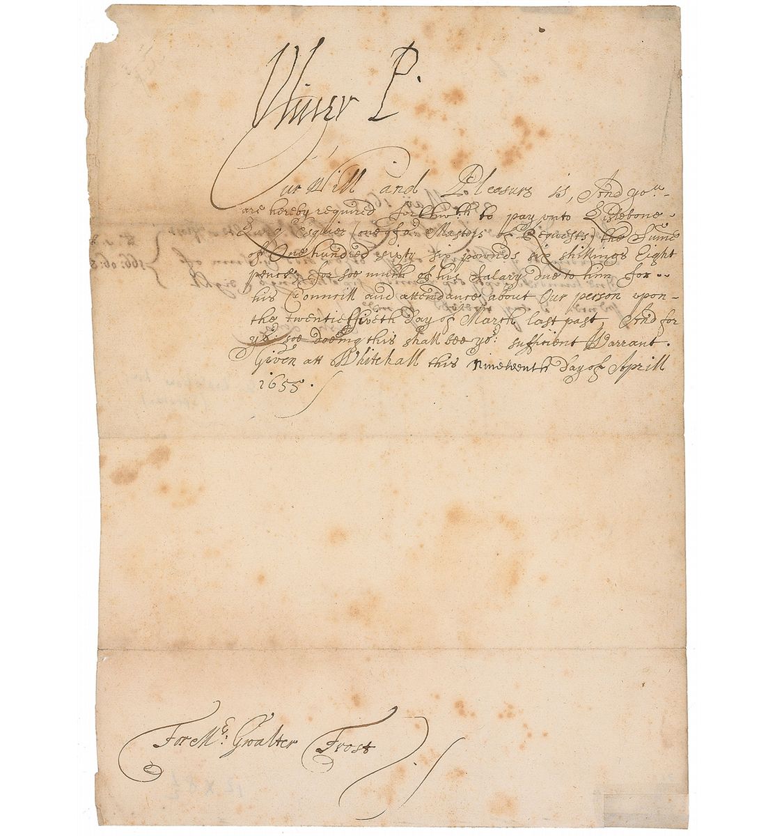 Manuscript DS, signed “Oliver P,” one page, 8 x 11.25, April 19, 1655. In full: “Our will and pleasure is, and governs hereby required…to pay unto Sislobono Long Esquire (and for Masters of Requests) the sum of one hundred sixty six pounds six shillings eight pence, for…much of his salary due to him.” Horizontal storage folds (one passing through text but not affecting signature), moderate overall foxing, show-through from period docketing to reverse, a small repaired cut to the lower right corner, and slightly trimmed edges, otherwise very good condition.