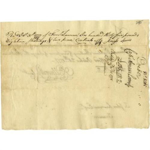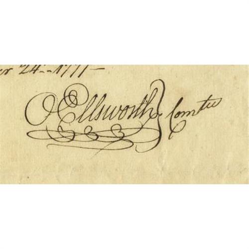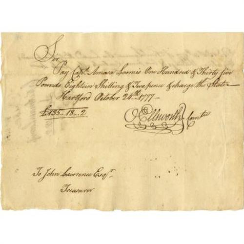 <B>Consitution Drafter Oliver Ellsworth 1777 Document Signed</B></I> "<I>O Ellsworth</B></I>" as a member of the Connecticut Committee of the Pay Table. One page manuscript with docketing and endorsement on verso, 8.25" x 6", Hartford, October 24,1777. Treasurer John Lawrence is instructed to "<I>Pay Capt. Amasa Loomis One Hundred & Thirty five Pounds Eighteen Shillings & Two Pence & charge the State.</B></I>" Loomis served the state well in the Revolutionary War and his company was at the "Lexington Alarm." He has endorsed the verso. Ellsworth is often credited with coining the term "United States of America" as a member of the five person committee to draft the Constitution. He was our nation's third Chief Justice and, as a senator, helped draft the bill that set up the federal judicial system. Very fine condition with original folds.<BR><BR><b>Shipping:</b> Flat Material, Small (<a target="_blank" href="http://www.heritageauctions.com/common/shipping.php">view shipping information</a>)