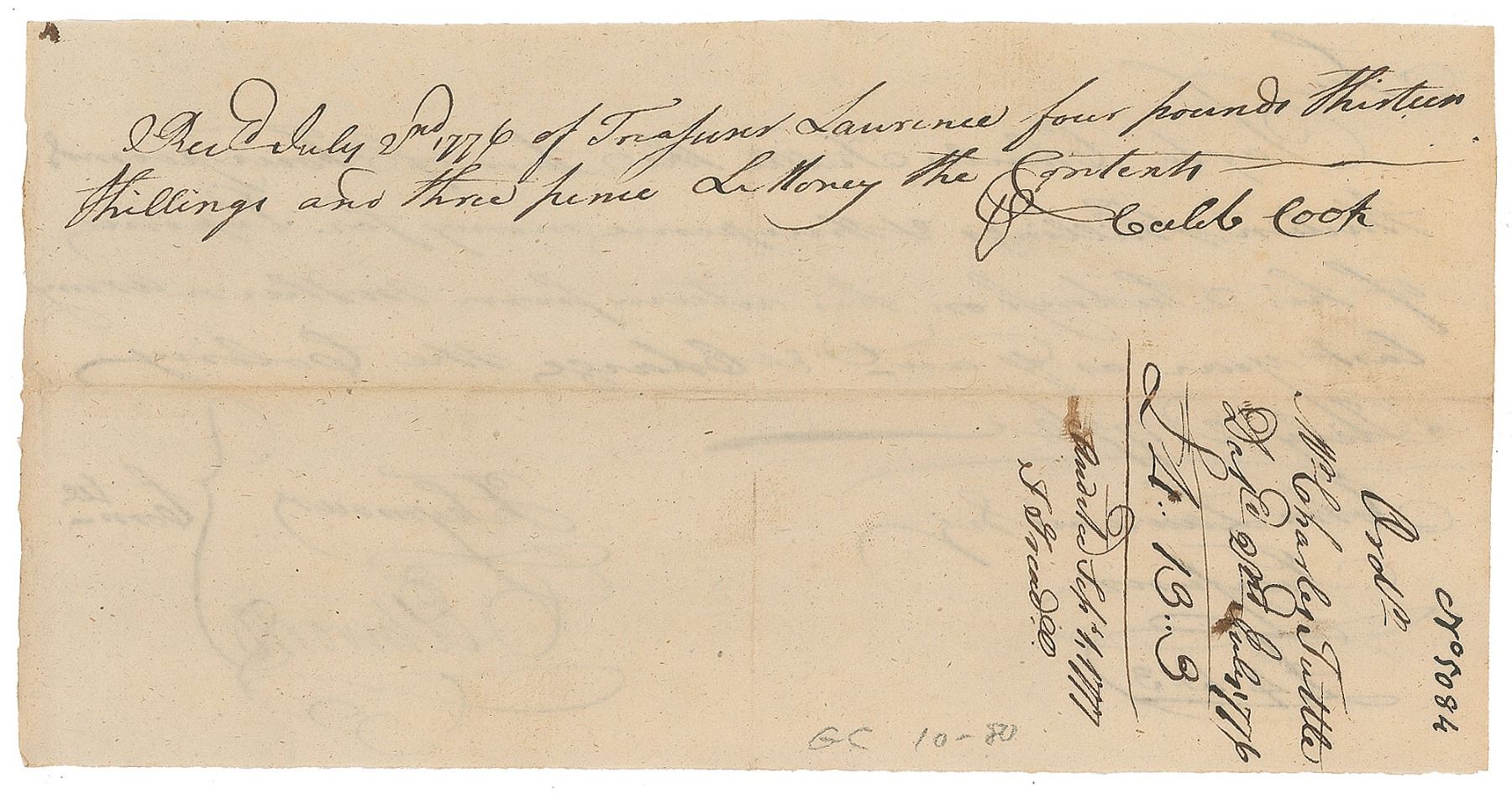 Revolutionary War-dated DS, signed “O. Ellsworth,” one page, 8.5 x 4.25, July 2, 1776. Pay order issued to Treasurer John Laurence, in part: "Pay to Charles Tuttle the Sum of Four pounds thirteen Shillings & three pence money for Expence of his Sickness on his return from Northern Army last year…& charge the colony." Signed at the conclusion by Oliver Ellsworth and countersigned by Thomas Seymour. In fine condition.