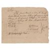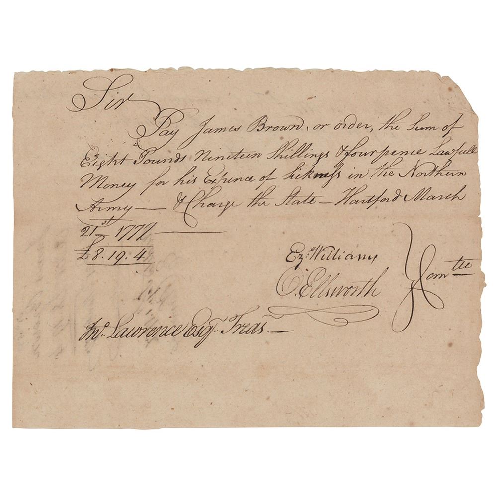 Revolutionary War–dated manuscript DS, signed “O. Ellsworth,†one page, 8.25 x 6.25, March 21, 1777. Pay order issued to Treasurer John Lawrence, in part: "Pay James Brown, or order, the Sum of Eight Pounds Nineteen Shillings & four pence Lawfull Money for his Expence of Likeness in the Northern Army." Signed at the conclusion by Oliver Ellsworth and Ezekiel Williams as members of the Pay-Table Committee. Endorsed on the reverse by Brown to confirm receipt of payment. In fine condition.