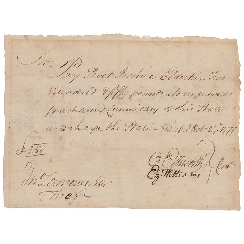 Manuscript DS, signed ‰ÛÏO. Ellsworth,‰Û one page, 8.25 x 6.25, October 24, 1777. A pay order to Treasurer John Lawrence, in part: "Pay Doct. Joshua Elderkin Two Hundred & fifty pounds to improve as purchasing commissary of this State." Signed at the conclusion by Oliver Ellsworth and Ezekiel Williams as members of the Pay-Table Committee. In fine condition, with intersecting folds and light toning.