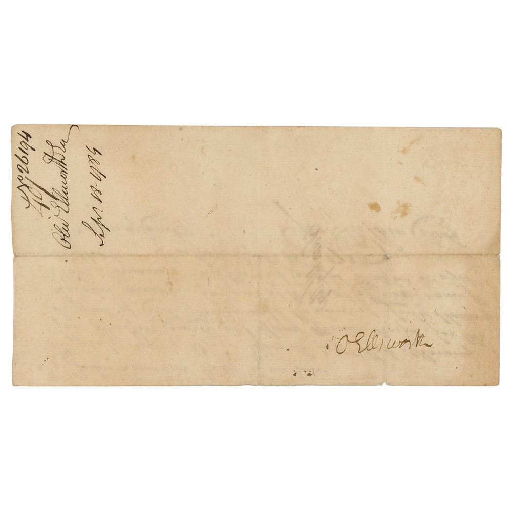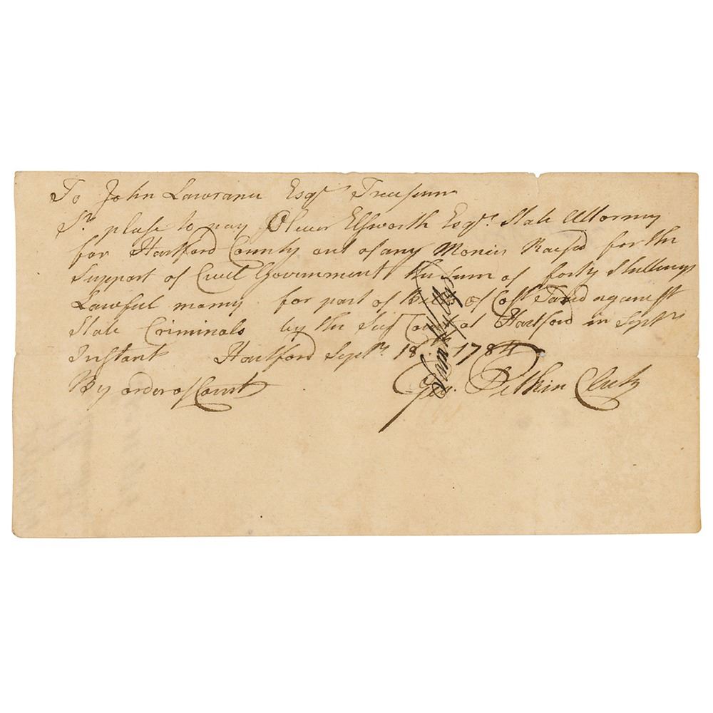Manuscript DS, signed O. Ellsworth, one page both sides, 7.75 x 4.25, September 18, 1784. Pay order submitted to Treasurer John Lawrence, signed on the front by George Pitkin and Samuel Wyllys, and endorsed on the reverse by Oliver Ellsworth. In part: "Please to pay Oliver Ellsworth Esq'r State Attorney for Hartford County out of any monies raised for the Support of Civil Government the sum of forty shillings Lawful money for part of Bills of Capt. Taud against State Criminals." In fine condition.