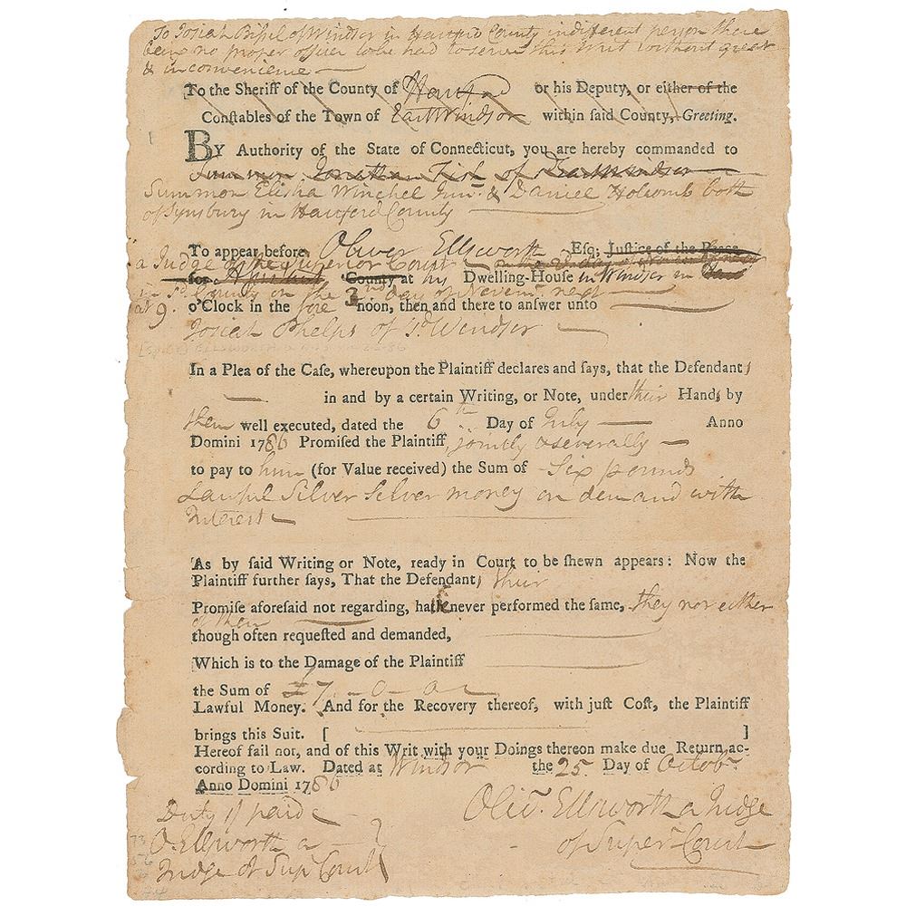 Third chief justice of the United States (1745-1807) and delegate to the Constitutional Congress who later submitted the amendments which became the Bill of Rights. Partly-printed DS, signed twice, “O. Ellsworth, a Judge of Sup. Court” and “Oliv. Ellsworth, a Judge of Super. Court,” one page, 6.5 x 8.75, October 25, 1786. Ellsworth orders the sheriff of Hartford to summon Elisha Winchel and Daniel Holcomb to appear before the court in response to a lawsuit. In fine condition.