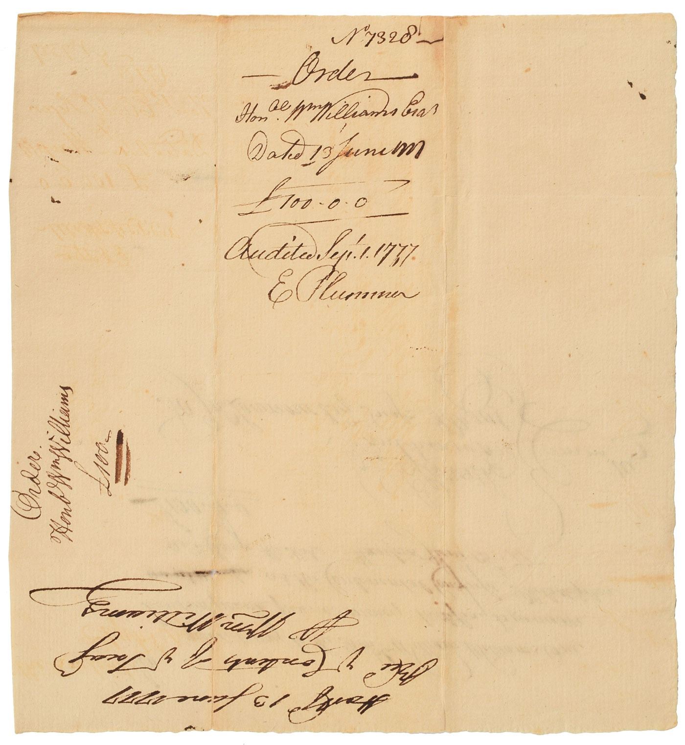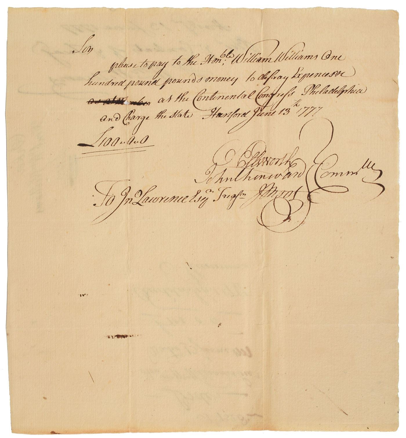Manuscript DS, signed “O. Ellsworth" and "Wm. Williams,” one page, 7.5 x 8.25, June 13, 1777. Pay order issued to Treasurer John Lawrence, in part: “Please to pay to the Hon'ble William Williams One hundred pound pounds money to defray Expenses at the Continental Congress Philadelphia and Charge the State." Signed at the conclusion by Ellsworth and two other officials, and endorsed on the reverse by Williams. In fine condition, with one small area of paper loss from ink erosion.