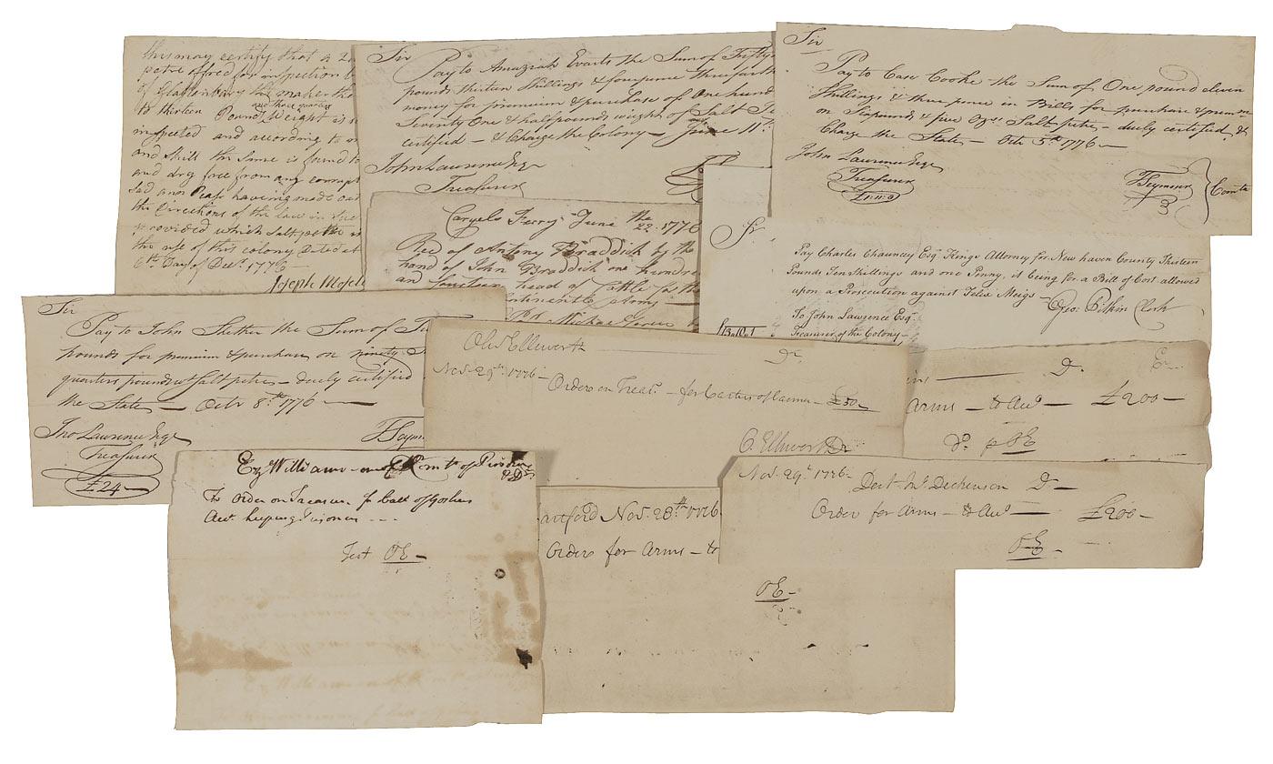 Exceptional archive of 11 Revolutionary War Pay Orders (all dated 1776), five being signed or initialed by Oliver Ellsworth, as a member of the Connecticut Pay Table Committee (one signed June 7, 1776, less than a month before the signing of the Declaration of Independence) for various supplies, mostly firearms for the Continental Army. The remaining six documents are pay orders for Salt Petre, used in the manufacture of gunpowder, signed by various members of the Connecticut Pay Table. In very good overall condition. A fascinating collection of documents directly related to the acquisition of supplies used by the Continental army against the British.