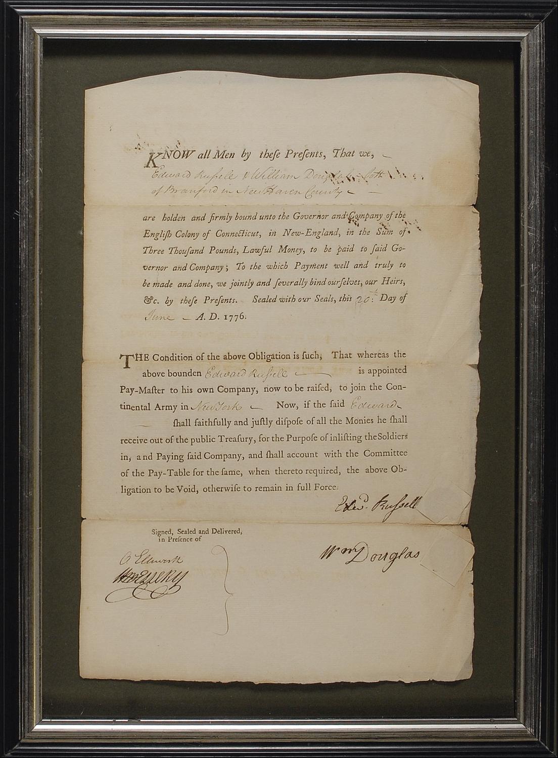 Third Chief Justice of the United States and delegate to the Constitutional Congress (1777–84) who later submitted the amendments which became the Bill of Rights. As a member of the Committee of the Pay Table, Ellsworth was one of the five men who supervised Connecticut’s war expenditures. Partly printed Revolutionary War dated DS, signed “O. Ellsworth,” one page, 8.75 x 13.5, June 20, 1776. A contract involving the enlistment of soldiers. In part: “Edward Russell & William Douglas, both of Branford in New Haven County are holden and firmly bound unto the Governor and Company of the English Colony of Connecticut, in New-England, in the Sum of Three Thousand Pounds…to be paid to said Governor and Company…. The Condition of the above Obligation is such, That whereas the above bounden Edward Russell is appointed Pay-Master to his own Company, not to be raised, to join the Continental Army in New York. Now, if the said Edward shall faithfully and justly dispose of all the Monies he shall receive out of the public Treasury, for the Purpose of inlisting the Soldiers in, and Paying said Company, and shall account with the Committee of the Pay-Table for the same, when thereto required, the above Obligation to be Void, otherwise to remain in full Force…” The document has been countersigned by both Russell and Douglas. Framed to an overall size of 12.5 x 17. In very good condition, with short partial separations and toning along horizontal folds (not affecting signatures) scattered mild wrinkling and toning. An impressive document with great Revolutionary War content.