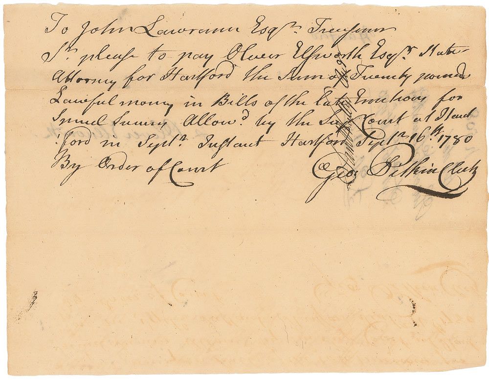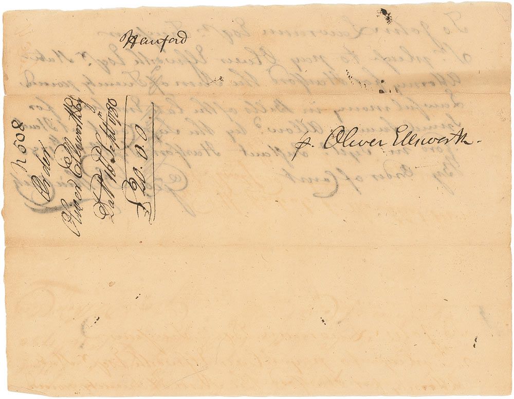 Endorsement signature, “Oliver Ellsworth,” on the reverse of a 8.25 x 6.5 pay order for Ellsworth for 20 pounds, dated September 16, 1780. Two horizontal folds, some scattered light toning, another endorsement through written text on front, as well as some light show-through from writing on reverse, otherwise fine condition.
