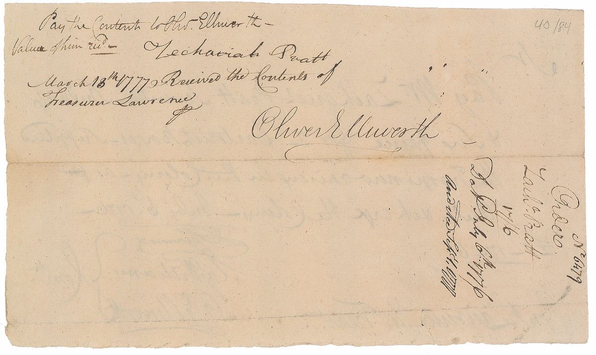 Third chief justice of the United States (1745–1807) and delegate to the Constitutional Congress who later submitted the amendments which became the Bill of Rights. Revolutionary War–dated manuscript DS, signed “O. Ellsworth” and “Oliver Ellsworth,” one page both sides, 8 x 5, July 6, 1776. Pay order addressed to Treasurer John Lawrence. In part: “Pay Mr. Zachariah Pratt Seventeen Shillings & Six pence for 3—Cartouch Boxes—supplied the Troops now raising in this Colony.” Signed at the conclusion by Ellsworth and two other officials, and signed again on the reverse by Ellsworth and Pratt upon receipt. In fine condition, with expected document wear. From just two days after July 4, 1776, this document dates to an extremely important day in American history—the Pennsylvania Evening Post printed the widely anticipated first newspaper rendition of the Declaration of Independence on July 6, the very first time it was disseminated to the public at large.
