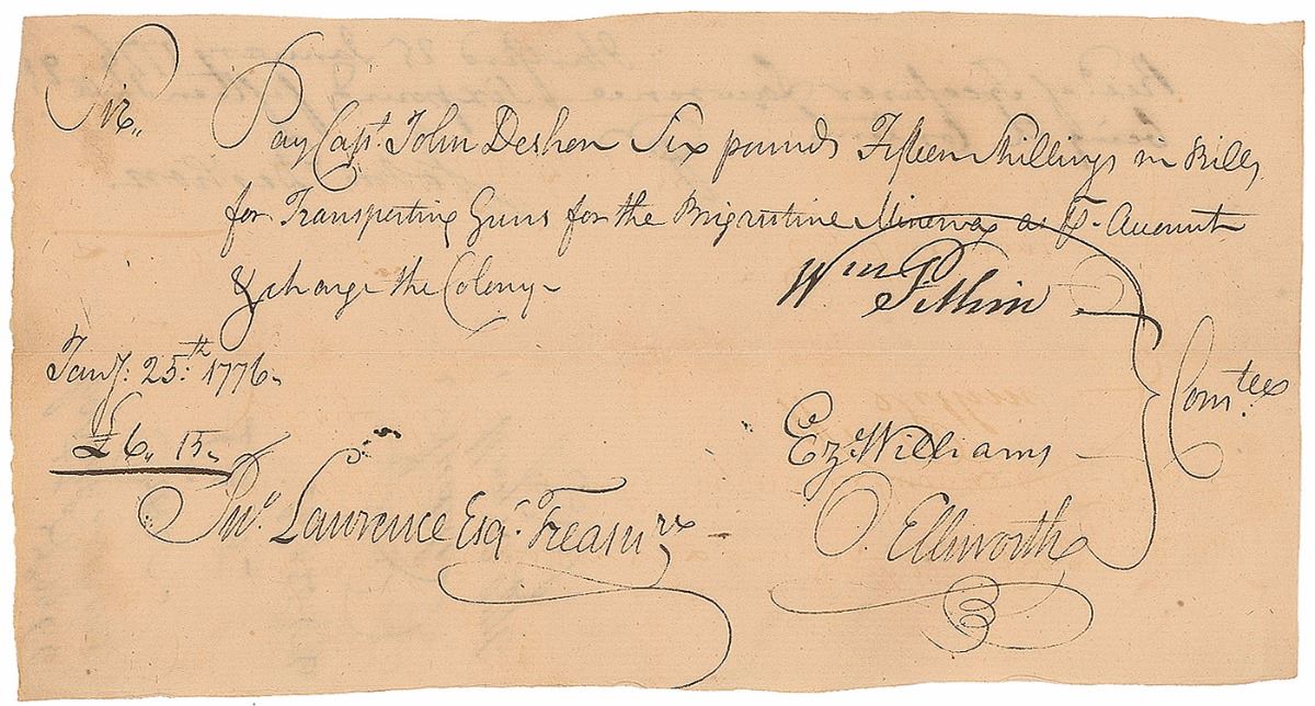 Revolutionary War-dated manuscript DS, signed “O. Ellsworth,” one page, 8.25 x 4.25, January 25, 1776. Pay order to Treasurer John Lawrence of Connecticut, in part: “Pay Capt. John Deshan Six pounds Fifteen Shillings in Bills for Transporting Guns of the Brigantine Minerva.” Signed at the conclusion by Ellsworth and two other members of the committee. In fine condition, with lightly trimmed edges.