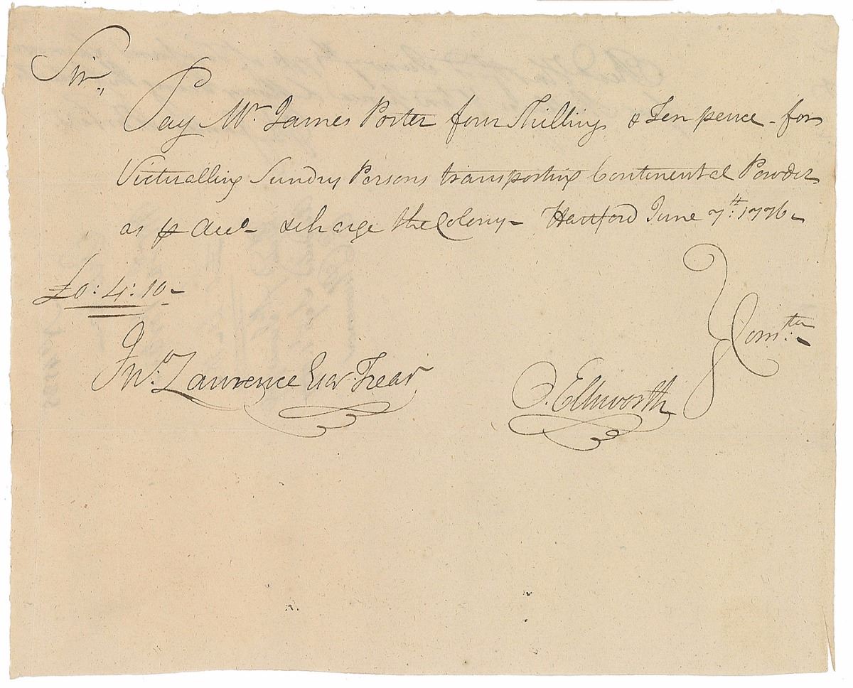 Revolutionary War–dated ADS, signed “O. Ellsworth,” one page, 8.25 x 6.75, June 7, 1776. Pay order submitted to Treasurer John Lawrence of Connecticut. In part. “Pay Mr. James Porter four Shillings & Ten pence for Victualling Sundry Persons transporting Continental Powder.” In fine condition, with expected document wear. An appealing example given its 1776 date and mention of “Continental Powder,” referring to gun powder specifically marked for the Continental Army.