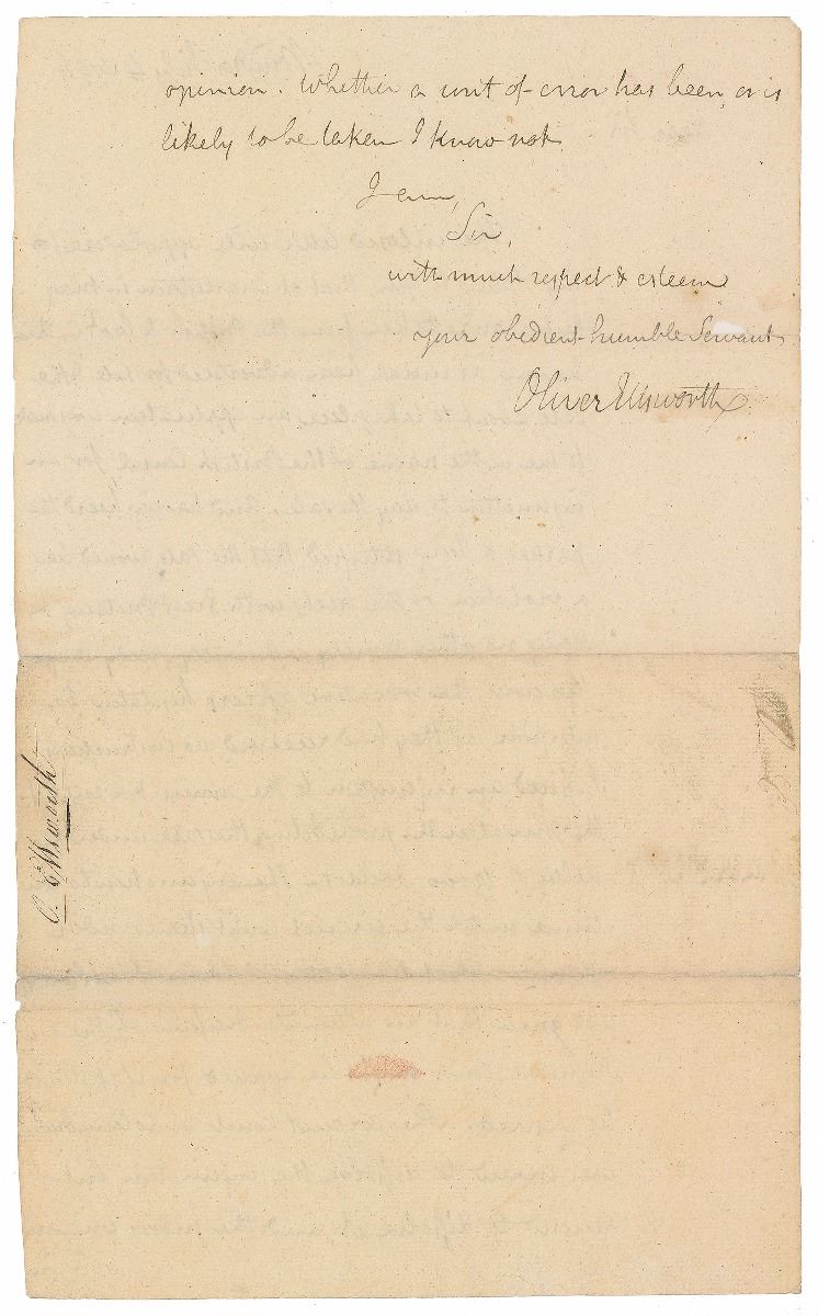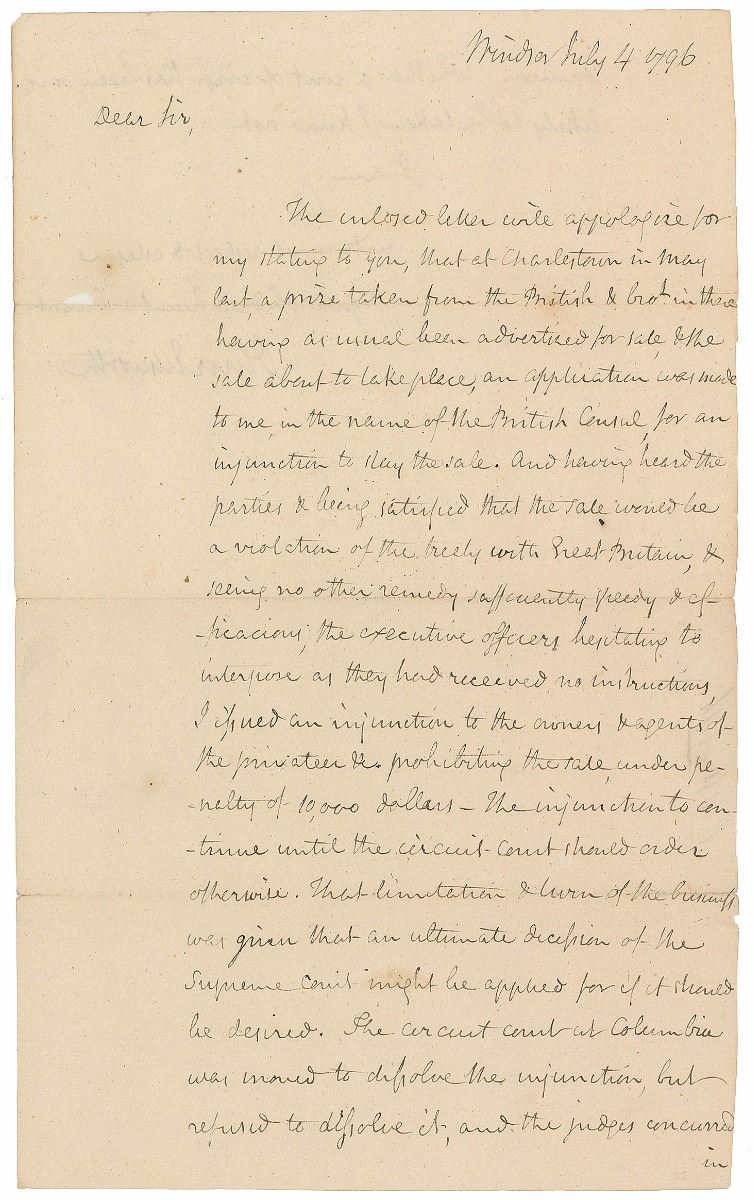 ALS, one page both sides, 7.75 x 12.75, July 4, 1796. Letter to John Lowell Newbury, Jr., written while serving as chief justice of the Supreme Court. In part: "The enclosed letter will appologise for my stating to you, that at Charlestown in May last, a prize taken from the British &…advertised for sale, & the sale about to take place, an application was made to me in the name of the British Consul for an injunction to stay the sale…Being satisfied that the sale would be a violation of the treaty with Great Britiain…The circuit court at Columbia was moved to dissolve the injunction, but refused to dissolve it.” In fine condition, with repaired separations to horizontal folds and a small hole affecting a word in the closing sentiment. Provenance: The Everett Fisher Collection.