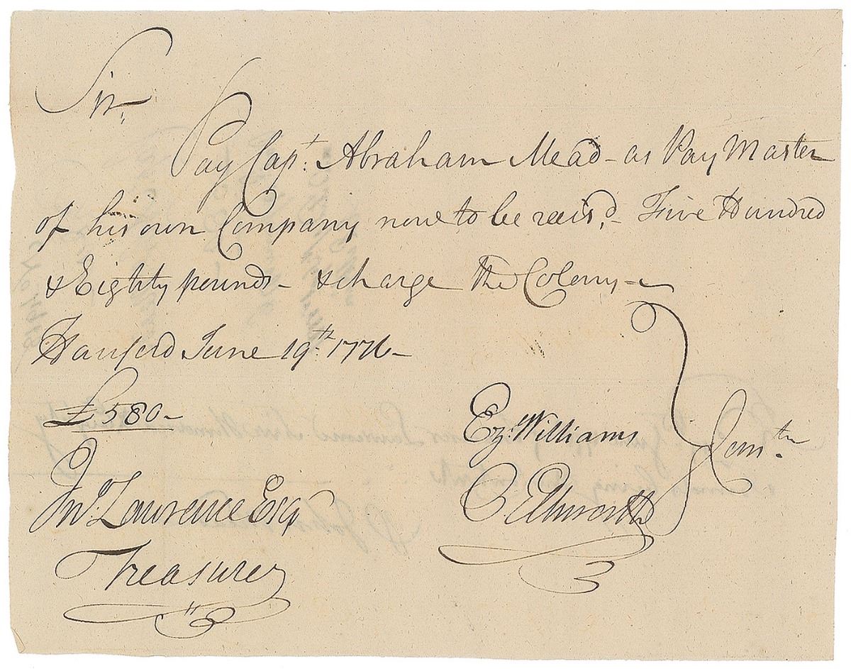 Revolutionary War–dated manuscript DS, signed “O. Ellsworth,” one page, 8 x 6.5, June 19, 1776. Pay order issued to Treasurer John Lawrence, in full: “Pay Capt: Abraham Mead, as Pay Master of his own Company now to be rais’d, Five Hundred & Eighty pounds, & charge the Colony.” Also endorsed on the reverse by Lt. Col. John Mead, a commander at the Battle of Harlem Heights. In fine condition. A desirable example dating to just two weeks before July 4, 1776.