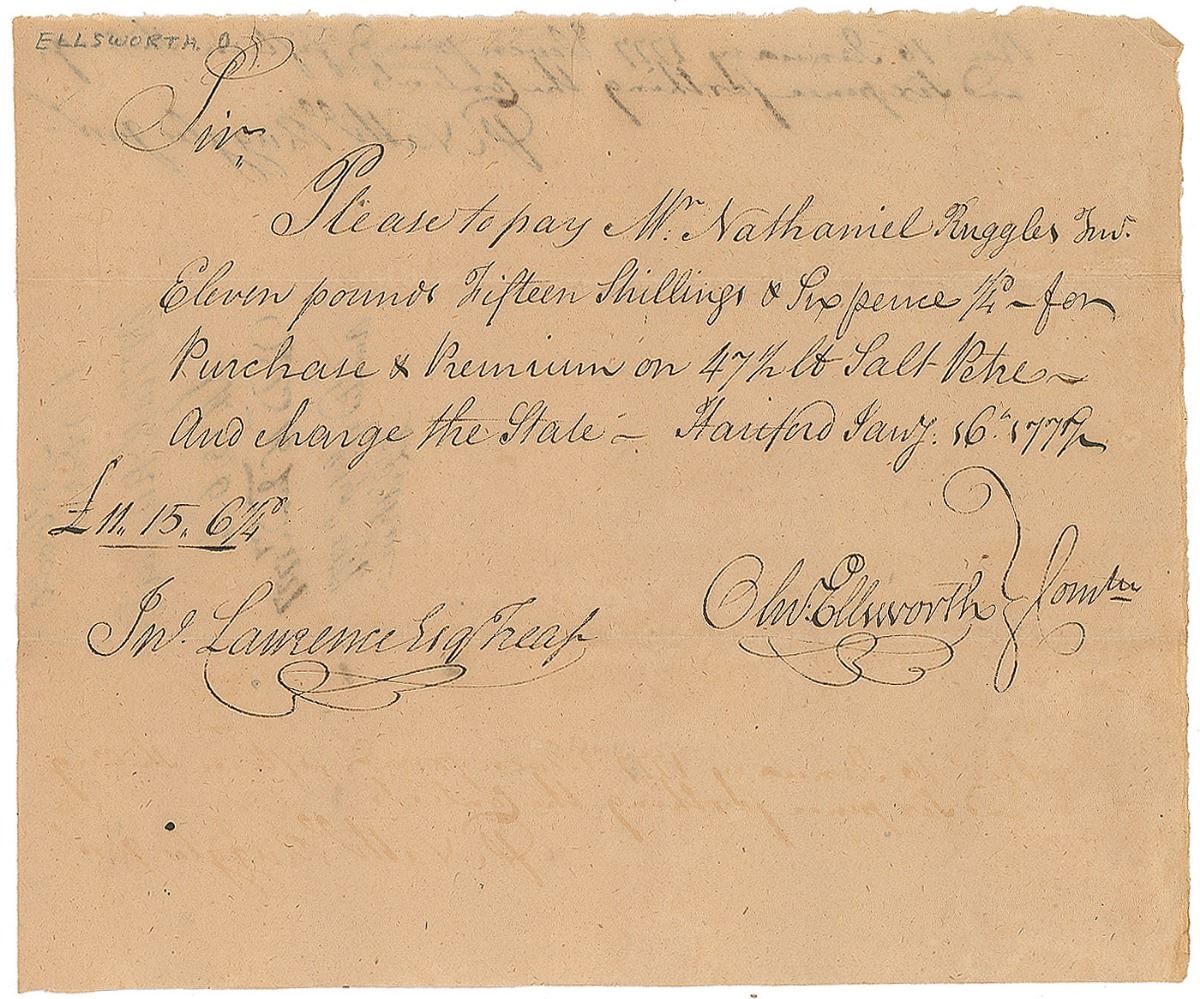 Revolutionary War-dated DS, signed “Oliv: Ellsworth,” one page, 7.5 x 6.25, January 16, 1777. Pay order to State Treasurer John Lawrence for payment to Nathaniel Ruggles “for the purchase & Premium on 47 1/2 lb Salt Petre.” Signed at the conclusion in black ink by Ellsworth. In fine condition, with writing showing through from opposing sides.