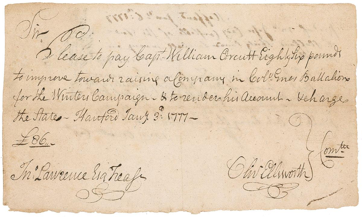 Third Chief Justice of the Supreme Court, appointed by Washington. Revolutionary War-dated manuscript DS, signed “Oliv. Ellsworth,” one page, 8.25 x 4.75, January 3, 1777. Ellsworth instructs the Treasurer to “pay Capt. William Orcutt Eighty Six pounds to improve toward raising a Company in Col. Enos Battalion for the Winter Campaign.” Signed at the conclusion by Ellsworth, who also dockets the reverse. Show-through from writing on reverse, intersecting folds, and some scattered light toning, otherwise fine condition. RRAuction COA.