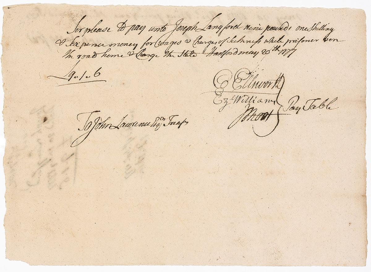 Third Chief Justice of the United States and delegate to the Constitutional Congress (1777–84) who later submitted the amendments which became the Bill of Rights. As a member of the Committee of the Pay Table, Ellsworth was one of the five men who supervised Connecticut’s war expenditures. DS, signed “O. Ellsworth,” one page, 8.5 x 6, May 20, 1777. An order to pay nine pounds one shilling to Joseph Langford, signed at the conclusion by Ellsworth. Light soiling, show-through from docketing on reverse and expected folds, otherwise fine condition. RRAuction COA.