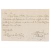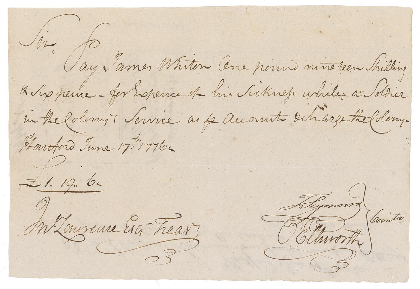 Third Chief Justice of the United States and delegate to the Constitutional Congress (1777–84) who later submitted the amendments which became the Bill of Rights. As a member of the Committee of the Pay Table, Ellsworth was one of the five men who supervised Connecticut’s war expenditures. Manuscript DS, signed “O. Ellsworth,” one page, 8.5 x 6, June 17, 1776. A draft ordering a payment to James Whiton “for expense of his sickness while a soldier in the Colony.” In fine condition, with two horizontal folds, and some scattered light creases.