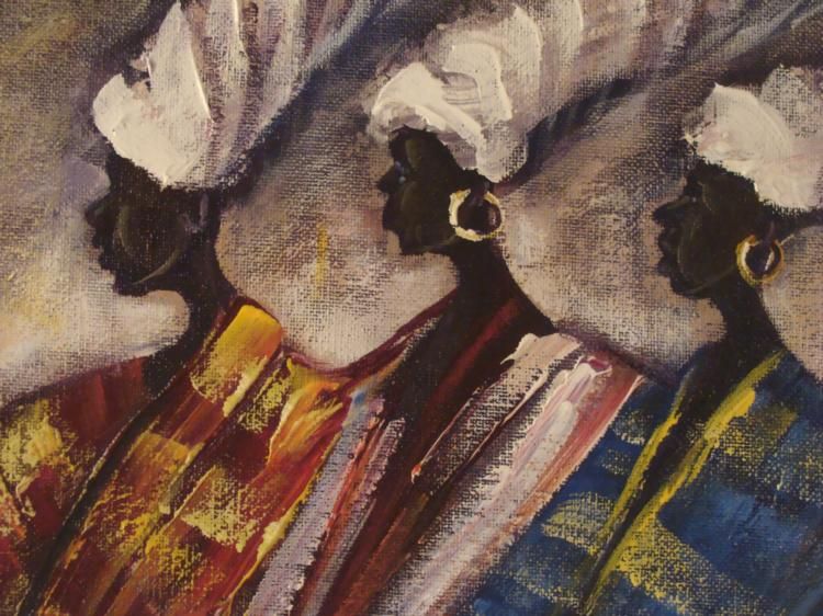 These three ladies are African royalty, with their beautiful gowns flowing down into one. Artist: Oliver Francis Signature: Lower rightTitle: Three Queens Medium: Acrylic on board Size: 16 x 20 inchesCondition: Excellent