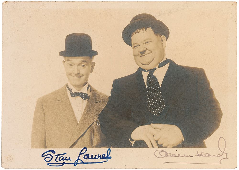 Vintage matte-finish 7 x 5 photo of Laurel and Hardy, signed by Hardy in fountain pen with a stamped Laurel signature. A crease to the upper left, some scattered soiling and light creases, and silvering to dark areas of the photo, otherwise fine condition.