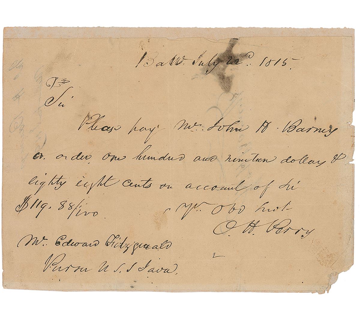 American military officer (1785–1819) who served in the War of 1812 and earned the title ‘Hero of Lake Erie’ for leading American forces in a decisive naval victory at the Battle of Lake Erie. ADS, signed “O. H. Perry,” one page, 7.75 x 5.75, July 22, 1815. Pay order submitted to Edward Fitzgerald on the USS Java. In full: “Please pay Mr. John H. Barney or order one hundred and nineteen dollars & eighty eight cents on account.” Affixed to a slightly larger sheet. In very good condition, with intersecting folds, scattered soiling, show-through from docketing and a large stray ink blot to reverse, and some chipping, small tears, and paper loss to edges.