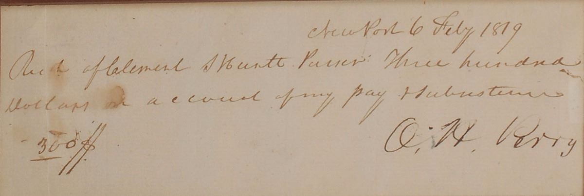 American military officer (1785–1819) who served in the War of 1812 and earned the title ‘Hero of Lake Erie’ for leading American forces in a decisive naval victory at the Battle of Lake Erie. Manuscript DS, signed “O. H. Perry,” one page, 6.5 x 2.25, February 6, 1819. Financial document issued at Newport confirming receipt of “Three hundred Dollars on account of my pay & subsistence.” Handsomely double-matted and framed with an engraved portrait to an overall size of 12.25 x 16.5. Expected document wear and some dampstaining affecting ink in a few words on the left side, otherwise fine condition.