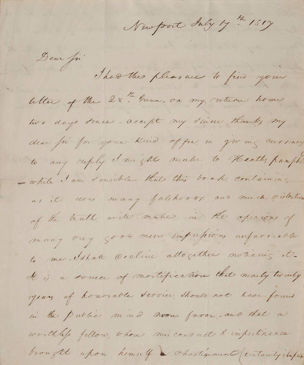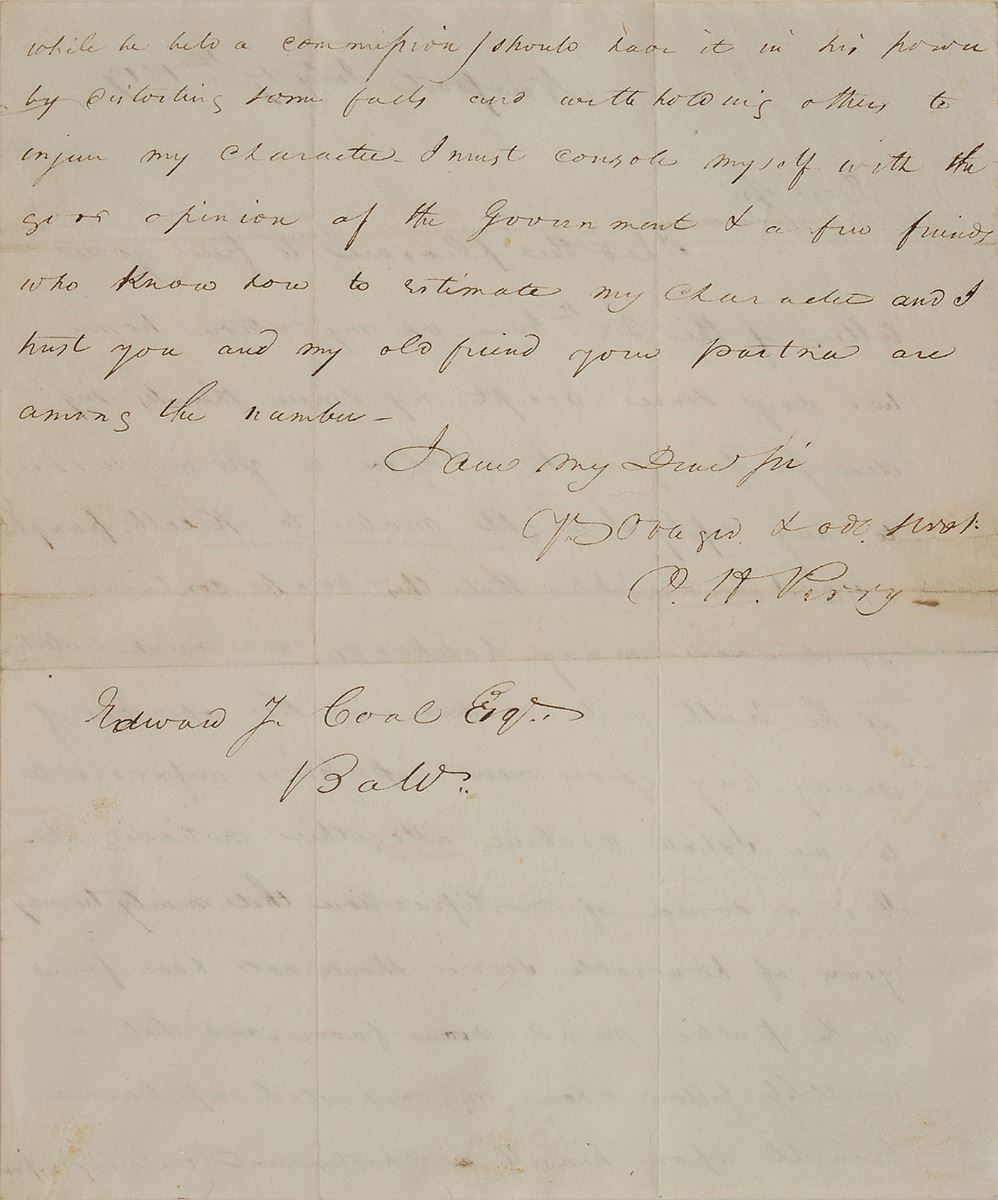 American military officer (1785–1819) who served in the War of 1812 and earned the title ‘Hero of Lake Erie’ for leading American forces in a decisive naval victory at the Battle of Lake Erie. ALS signed “O. H. Perry,” one page both sides, 8 x 9.75, July 17, 1817. Letter to Edward J. Coal of Baltimore, in full: “I had the pleasure to find your letter of the 28th June on my return home two days since—accept my sincere thanks my dear for your kind offer in giving currency to any reply I might make to Heaths pamphlet—while I am sensible that this book containing as it does many falsehoods and much distortion of the truth will make in the opinions of many any good men impressions unfavorable to me—I shall decline altogether noticing it—It is a source of mortification that nearly twenty years of honorable service should not have found in the public mind some favor—and that a worthless fellow, whom misconduct & impertinence brought upon himself a chastizement (certainly improper while he held a commission) should have it in his power by distorting some facts and with holding others to injure my character I must console myself with the good opinion of the Government & a few friends who know how to estimate my character and I trust you and my old friend your partner are among the numbers.” Encapsulated in a mylar sleeve. In fine condition.