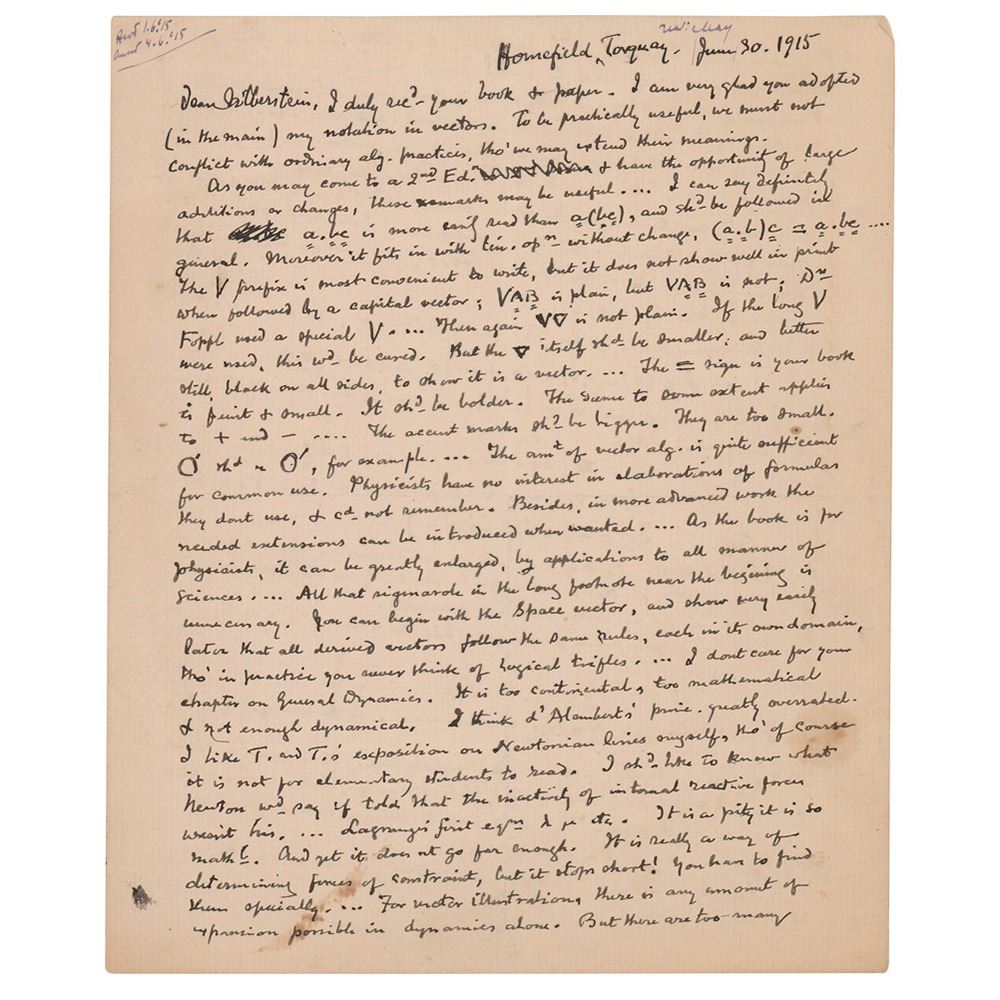 ALS, one page both sides, 6.5 x 8, June 30, 1915. Handwritten letter to Dr. Ludwik Silberstein, acknowledging receipt of Silberstein’s book—most probably, based on his comments, 'Vectorial Mechanics,' published in 1913—and commenting extensively thereon. Of interest here, though, are his comments concerning Silberstein’s presentation of dynamics.