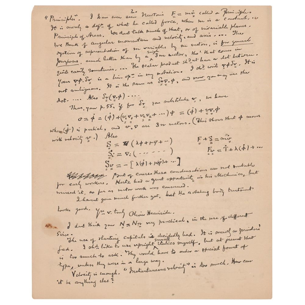 He goes on to offer some editorial guidance and typesetting instructions, followed by further criticism: "The am't of vector alg. is quite sufficient for common use. Physicists have no interest in elaborations of formulas they don't use, & c'd not remember. Besides, in more advanced work the needed extensions can be introduced when wanted…. As the book is for physicists, it can be greatly enlarged, by applications to all manner of sciences…All that rigamarole in the long footnote near the beginning is unnecessary. You can begin with the Space vector, and show very easily later that all derived vectors follow the same rules, each in its own domain, tho' in practice you never think of logical trifles….I don't care for your chapter on General Dynamics. It is too continental, too mathematical & not enough dynamical. I think d'Alembert's princ. greatly overrated. I like T. and T.'s exposition on Newtonian lines myself, tho' of course it is not for elementary students to read. I sh'd like to know what Newton w'd say if told that the inactivity of internal reactive forces wasn't his…Lagrange's first eq'n λ μ etc. It is a pity that it is so math'l. And yet it does not go fat enough…There are too many 'Principles.' I have even seen Newton's F=ma called a Principle. It is merely a def'n of what he called force, when m is a constant…Principle of Areas. We don't talk much of that, or of invariable planes. We think of angular momentum and velocity, and axis." Silberstein notes the dates of receipt and reply at the top. In fine condition, with a couple small stains. Heaviside's autograph is exceedingly rare—we find no records of any having been publicly offered for sale in the past.