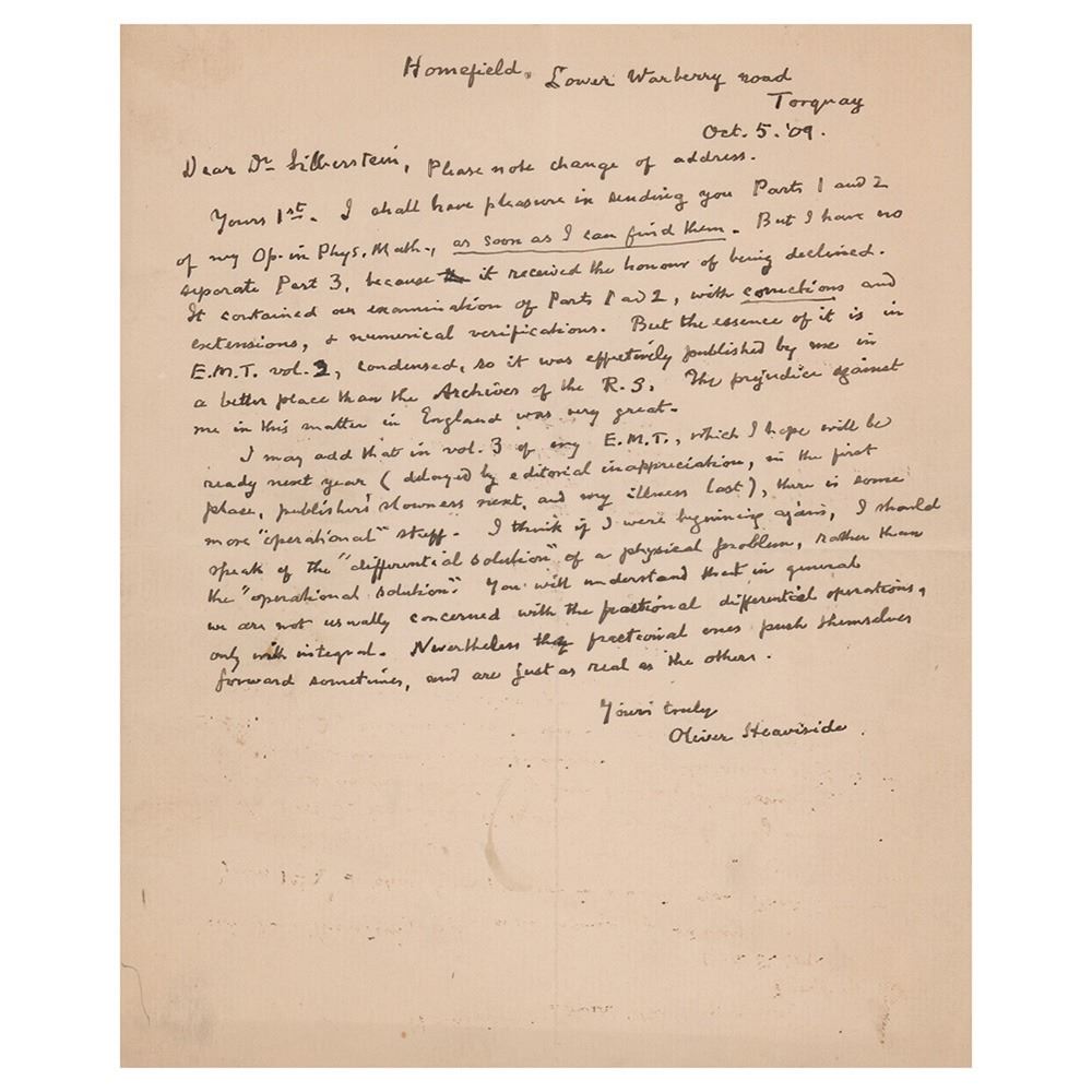 ALS, one page, 6.5 x 8, October 5, 1909. Handwritten letter to Dr. Ludwik Silberstein, responding to a request for reprints of his papers 'On Operators in Physical Mathematics,' first published in 1892–93. These summarized his work on what he called 'operational calculus,' a method of turning differential equations into algebraic ones, and thus simplifying the process of obtaining solutions. This work was heavily criticized at the time due to a perceived lack of rigor. In fact, as Heaviside relates in this letter, the journal Proceedings of the Royal Society, which had published the first two parts, declined to publish the third. He then condensed the concepts and incorporated them into the second volume of his Electromagnetic Theory (1899); the third volume, plagued by delays described here, would not be published until 1912. Heaviside’s operational methods allowed him to deal with “fractional” differentiation—the taking of derivatives to fractional powers, rather than just the integral powers which are familiar. Responding to his critics, Heaviside famously stated: 'Mathematics is an experimental science, and definitions do not come first, but later on. They make themselves, when the nature of the subject has developed itself.'