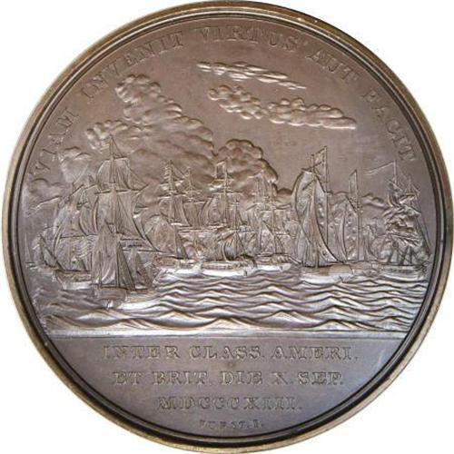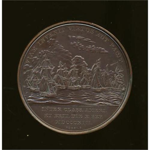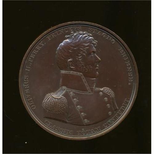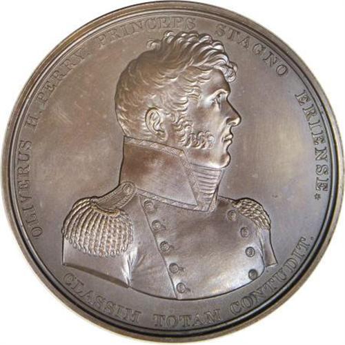 <B>Master Commandant Oliver H. Perry Medal, Julian-NA-17, MS64 NGC.</B></I> Bronzed copper, 65 mm, 132.2 gm. Dies by Moritz Furst. Obverse bust right, no artist's signature, legend around OLIVERUS H. PERRY. PRINCEPS STAGNO ERIENSE. CLASSIM (sic) TOTAM CONTUDIT ("Oliver H. Perry, commander-in-chief, destroyed an entire fleet on Lake Erie"), FURST.F. absent on bust truncation. Reverse (as on Elliott medal, NA-10), around and in exergue VIAM INVENIT VIRTUS AUT FACIT (no star after) / INTER CLASS. AMERI. ET BRIT. DIE X SEP. MDCCCXIII ("Virtue finds or makes a way / Between the fleets of America and Britain September 10, 1813"), FURST.F. below. These are the dies illustrated in Julian.<BR> Julian notes that "the obverse and reverse dies of this medal were broken by July, 1866, but not replaced until 1869. ... When the obverse was replaced the artist's name was left off. This unsigned obverse was still being used in 1885; it is believed that FURST has not been used on any obverse die since 1866. The bust executed in 1869 is inferior to the original in quality.<BR> "CLASSIM in the obverse legend should be spelled CLASSEM."<BR> This glossy brown near-Gem offers generous appeal via its prooflike surfaces with much luster remaining, accented with blue and pinkish-red. There are no mentionable impairments. Complete with NGC Photo Certificate. An example from the same dies, "Lovely Unc.," in the noted Kessler-Spangenberger sale (NASCA, 4/1981, lot 1709), brought $110.<BR><BR><b>Shipping:</b> Coins & Currency (<a target="_blank" href="http://www.heritageauctions.com/common/shipping.php">view shipping information</a>)