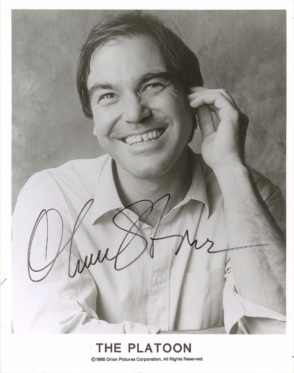 Superb glossy 8 x 10 Orion Pictures publicity photo of the Oscar-winning director of Platoon, signed in black felt tip by Stone. In fine condition. From the Harvey and Rhoda Kuflik Collection. Pre-certified PSA/DNA.