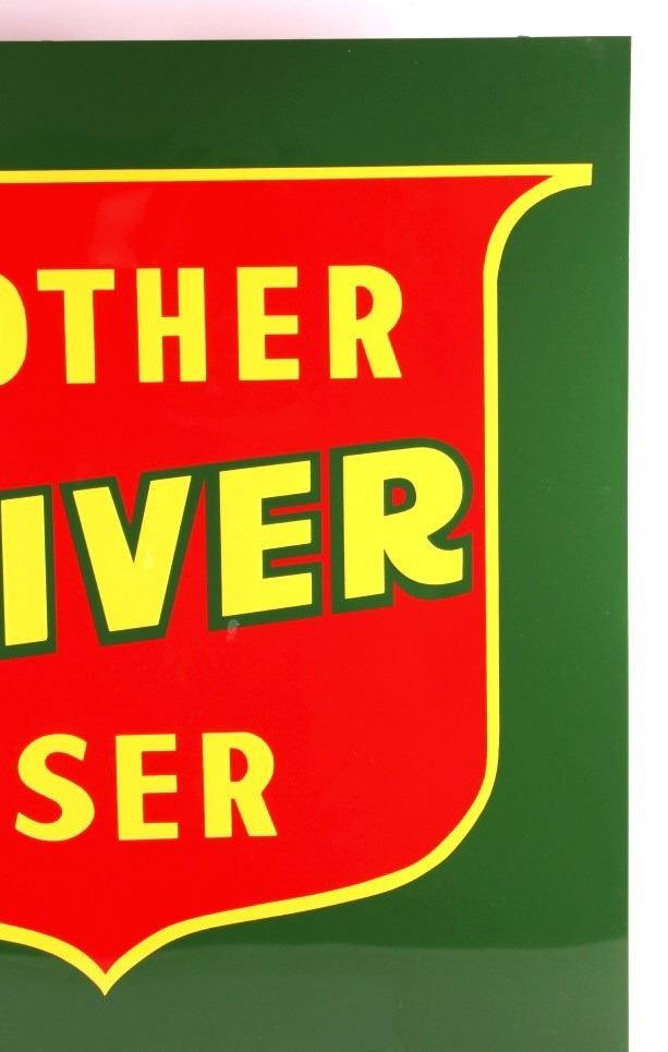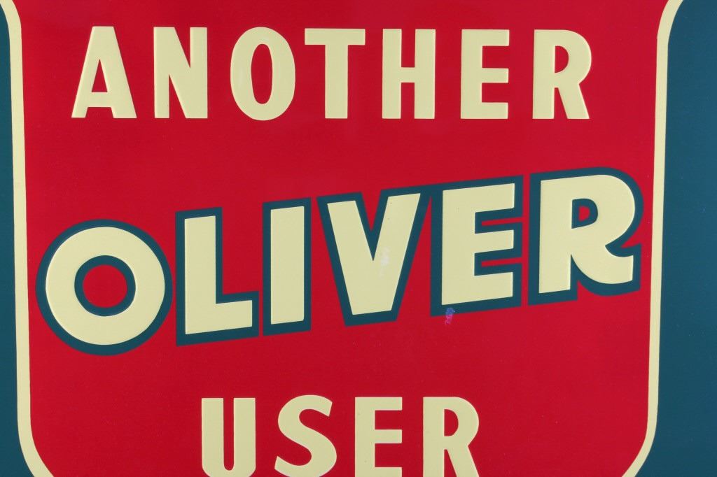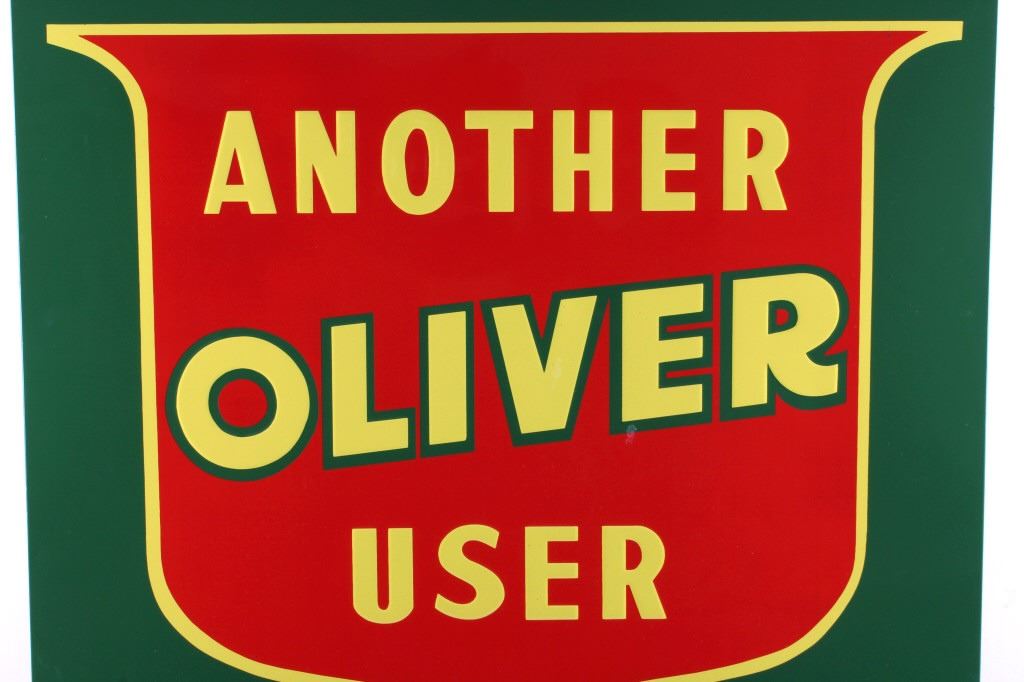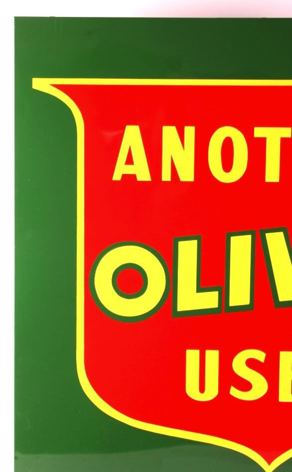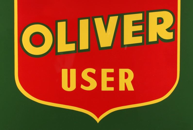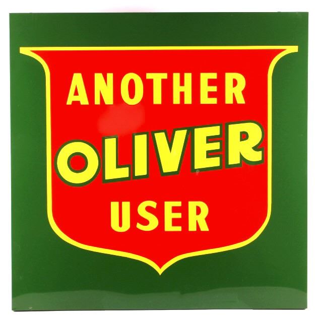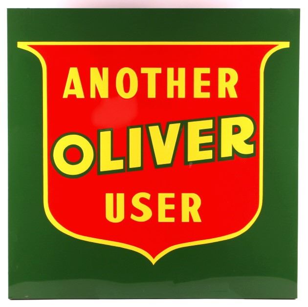 This is an Oliver Tractor advertising sign. The sign is embossed tin and shows the shield logo. The sign reads "Another Oliver User". The sign is mounted to a wooden frame. The Oliver Tractor sign is in good condition. It measures 34" x 34".