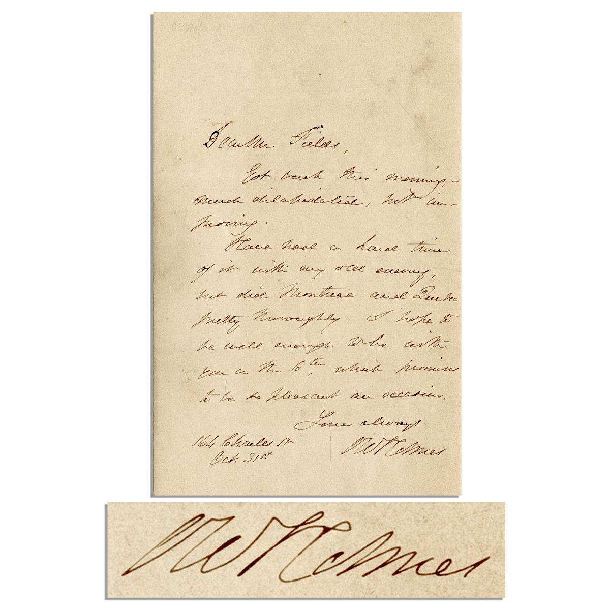 Oliver Wendell Holmes autograph letter signed ''OW Holmes'' to a Mr. Fields -- likely poet James Thomas Fields. It's datelined 31 October from 164 Charles St.; Holmes' Boston residence from 1858 to 1870. The physician and author who exposed the cause of puerperal fever writes: ''Got back this morning. Much dilapidated, not improving. Have had a hard time of it with my old enemy, but did Montreal and Quebec pretty thoroughly. I hope to be well enough to be with you on the 6th, which promises to be so pleasant an occasion. Love always / OW Holmes''. Measures 4.5'' x 7'' on card-style stationery. Toning, creasing, and minor foxing to verso, else near fine.