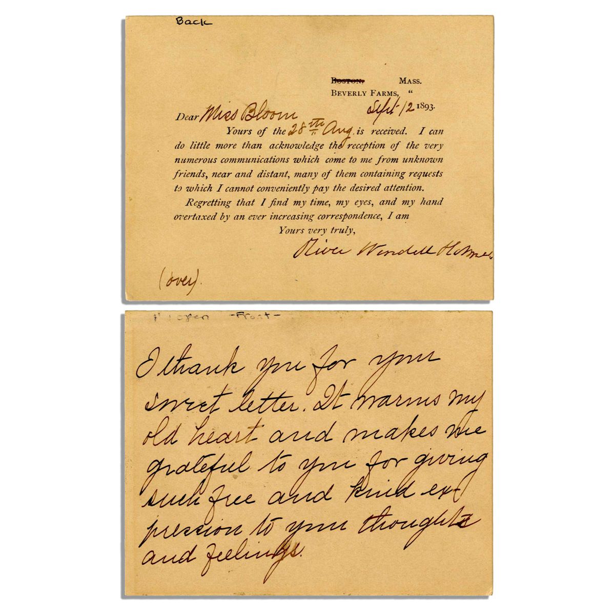 Oliver Wendell Holmes typed letter signed with autograph note inscribed to verso. Holmes' autograph note reads in full, ''I thank you for your sweet letter. It warms my old heart and makes me grateful to you for giving such free and kind expression to your thoughts and feelings.'' The printed letter, dated 12 September 1893, filled in and signed by Holmes, reads in full: ''Dear Miss Bloom / Yours of the 28th Aug is received. I can do little more than acknowledge the reception of the very numerous communications which come to me from unknown friends, near and distant, many of them containing requests to which I cannot conveniently pay the desired attention. Regretting that I find my time, my eyes, and my hand overtaxed by an ever increasing correspondence, I am / Yours very truly, [signed] Oliver Wendell Holmes''. Card measures 4.5'' x 3.5''. Includes original hand-addressed envelope. Minute notations to top edge of both sides of letter, and uniform toning. Very good condition.