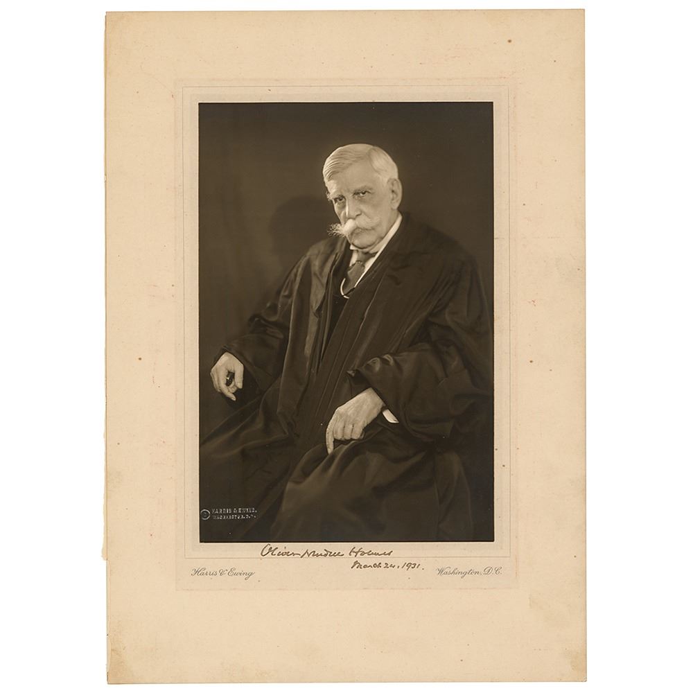 Vintage matte-finish 6 x 9 Harris and Ewing photo of Holmes seated in his judicial robe, signed on the original 9.75 x 13.75 studio mat in black ink, "Oliver Wendell Holmes, March 24, 1931." In very good to fine condition, with light silvering and small surface impressions to the image. Holmes is uncommon in signed photos, particularly formal portraits.