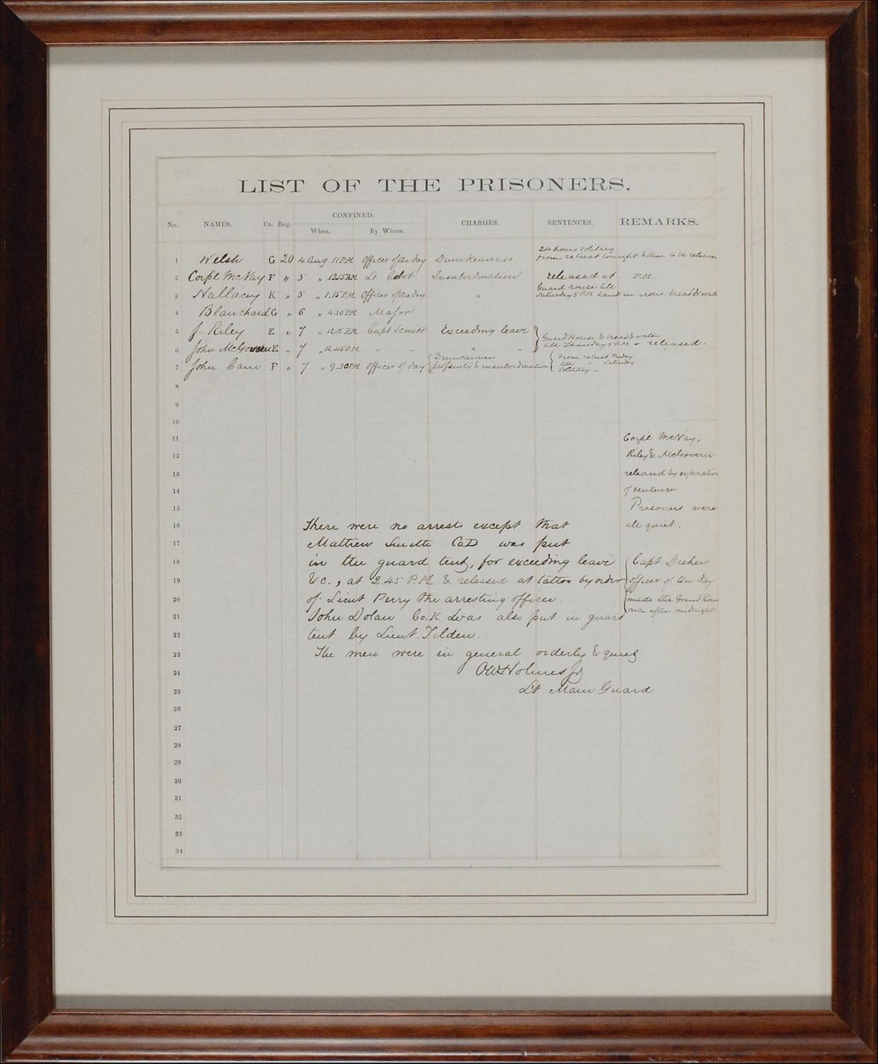 Associate Justice of the Supreme Court (1841–1935) from 1902 to 1932. Extremely early manuscript DS, signed “O. W. Holmes, Jr., Lt. Main Guard,” one page, 10 x 13, no date, but circa August 7, 1862. A “List of the Prisoners,” filled out in another hand, listing seven soldiers, the arresting officer, charges, and sentences. A sample of the offenses are: “Welsh…Drunkeness…24 hours solitary,” “Hallacey…[Insubordination]…Guard house till Saturday 5 pm, hands in irons, bread & water,” and “J. Reilly…Exceeding leave…Guard house & bread & water.” In the lower portion of the document Holmes writes: “There were no arrests except that Matthew Swilte, Co. D., was put in the guard tent, for exceeding leave & c, at 2:45 P.M. & released at tattoo by order of Lieut. Perry the arresting officer. John Dolan Co. K. was Also put in the guard tent by Lieut. Tilden. The men were in general orderly & quiet.” Matted and framed to an overall size of 16 x 19.5. Light show-through from printing on reverse, scattered light toning, and some light surface marks probably from a removed entry, otherwise fine condition. An uncommon document with excellent Civil War content dating from the dawn of the celebrated jurist’s illustrious life.
