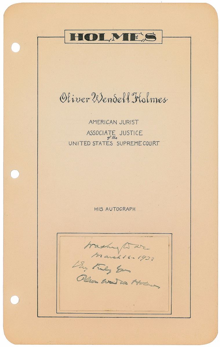 Fountain pen signature, “Very truly yours, Oliver Wendell Holmes, Washington DC, March 16, 1933,” on an off-white card affixed to a handsome 6 x 9.5 album page hand-embellished with a calligraphic title. In fine condition.