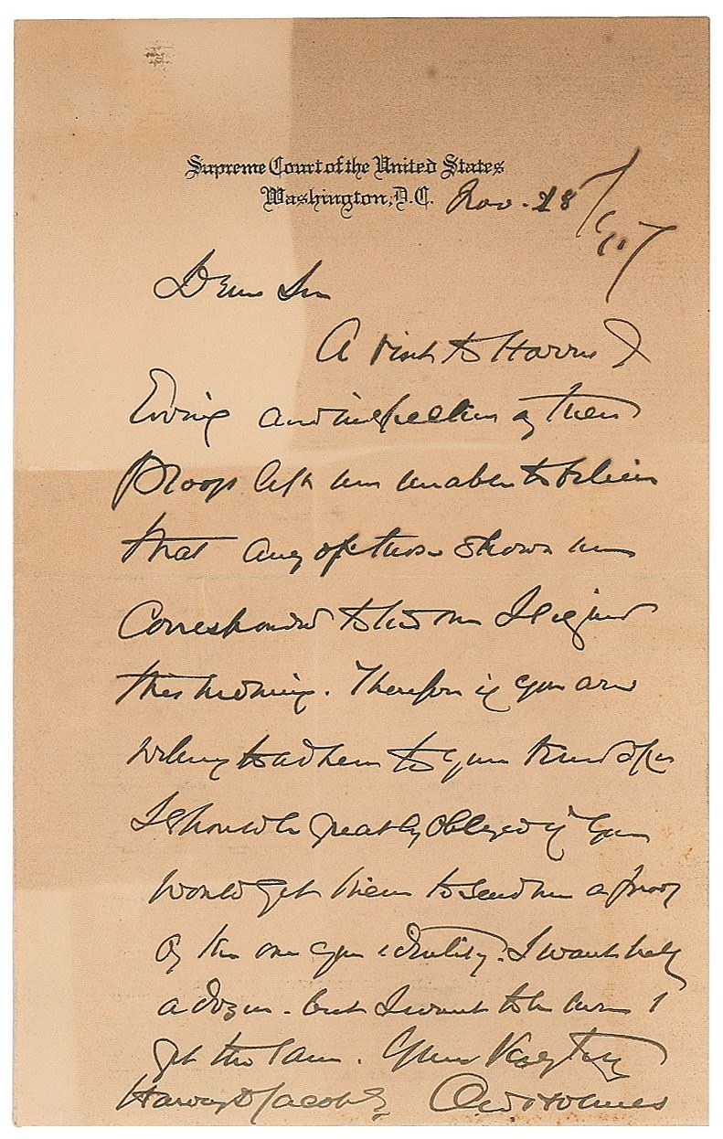 ALS signed “O. W. Holmes,” one page, 5 x 7.75, Supreme Court of the United States letterhead, November 18, 1917. Letter to Harvey D. Jacobs, in full: "A visit to Harris & Ewing and inspection of their proofs left me unable to believe that any of those shown me correspond to the one I sighted this morning. Therefore if you are willing to adhere to your kind offer, I should be greatly obliged if you would get them to send me a proof of the one you identify. I want half a dozen, but I want to be sure I get the same." In very good to fine condition, with irregular overall toning.