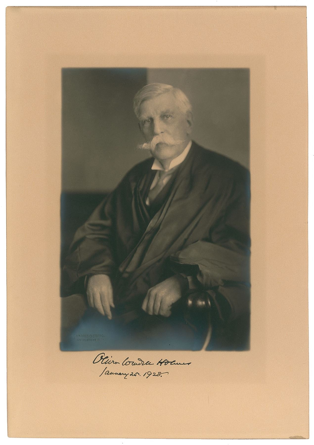 Excellent vintage matte-finish 9.5 x 13.75 portrait of Justice Holmes in his judicial robe by the Harris & Ewing Studio, signed below in fountain pen, "Oliver Wendell Holmes, January 25, 1928." Lower left of image bears the studio blindstamp. In very good to fine condition, with two creases in the borders.
