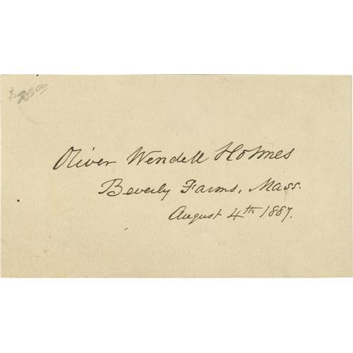 <B>Oliver Wendell Holmes Sr. Autograph Card Signed</B></I> "<I>Oliver Wendell Holmes/ Beverly Farms, Mass./ August 4th 1887</B></I>". 5.25" x 3", in fine condition. Oliver Wendell Holmes Sr. (1809-1894) was a physician, author and father of Civil War hero Oliver Wendell Holmes Jr.<BR><BR><b>Shipping:</b> Flat Material, Small (<a target="_blank" href="http://www.heritageauctions.com/common/shipping.php">view shipping information</a>)