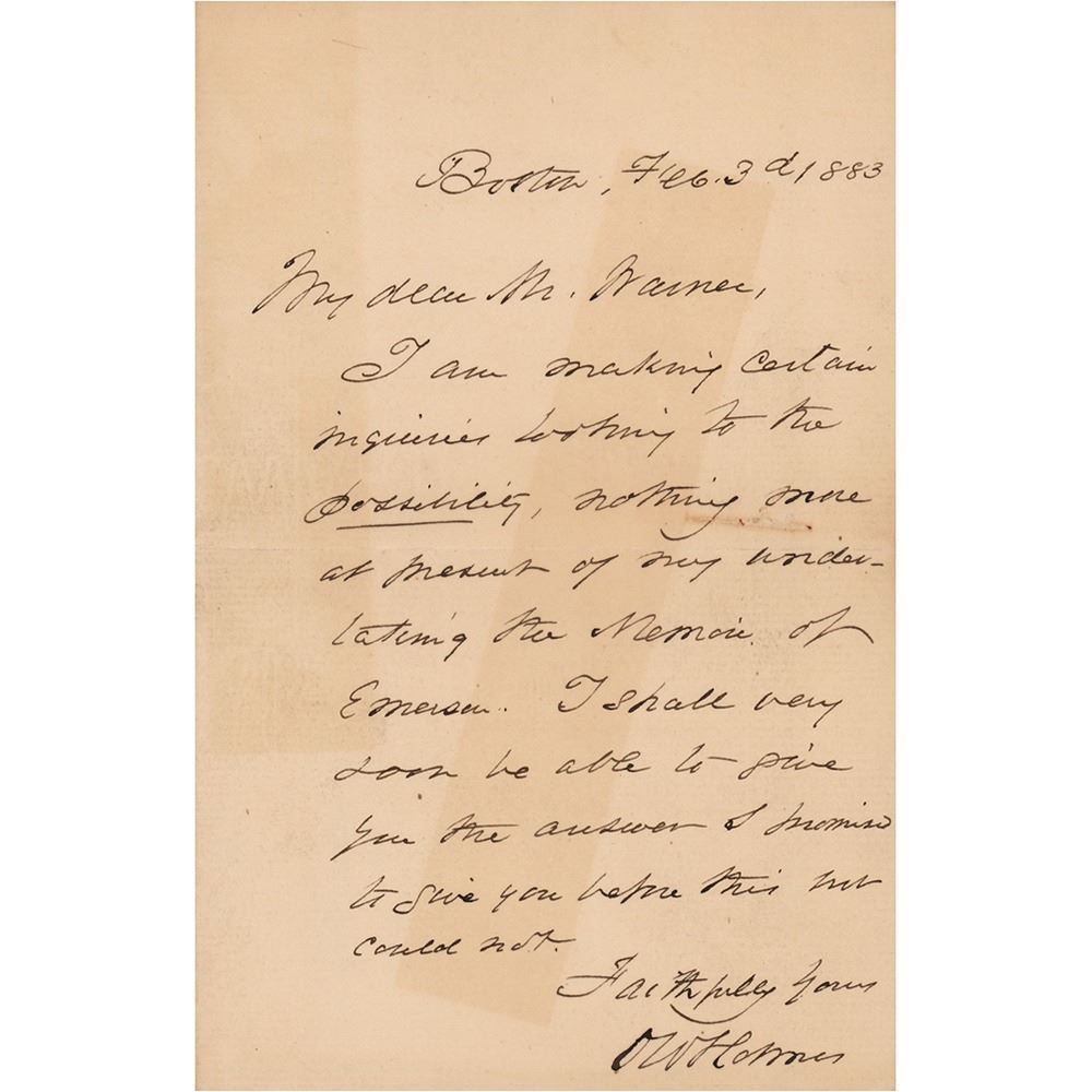 ALS signed “O. W. Holmes,” one page, 4.5 x 7, February 3, 1883. Handwritten letter to writer and editor Charles Dudley Warner, best remembered as the co-author of The Gilded Age with Mark Twain. In full: "I am making certain inquiries looking to the possibility, nothing more at present of my undertaking the Memoir of Emerson. I shall very soon be able to give you the answer I promised to give you before this but could not." In fine condition. Warner served as editor for Houghton Mifflin's 'American Men of Letters' series of biographies. Holmes contributed the volume on the great transcendentalist Ralph Waldo Emerson, published in 1885.