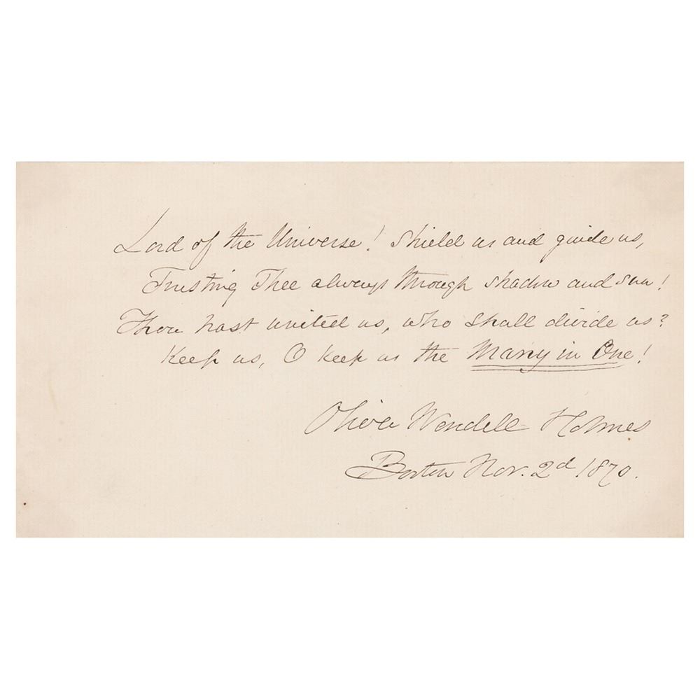AQS on an off-white 7.25 x 4 sheet, signed at the conclusion in ink, "Oliver Wendell Holmes, Boston, No. 2d 1870." Handwritten quote from Oliver Wendell Holmes's poem 'Union and Liberty,' in full: "Lord of the Universe! Shield us and guide us, / Trusting thee always through shadow and sun! / Thou hast united us, who shall divide us? / Keep us, O keep us the many in one!" In fine condition.