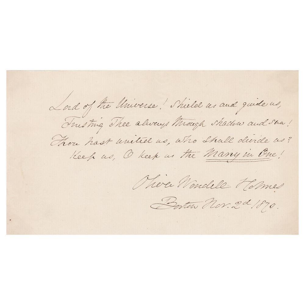 AQS on an off-white 7.25 x 4 sheet, signed at the conclusion in ink, "Oliver Wendell Holmes, Boston, No. 2d 1870." Handwritten quote from Oliver Wendell Holmes's poem 'Union and Liberty,' in full: "Lord of the Universe! Shield us and guide us, / Trusting thee always through shadow and sun! / Thou hast united us, who shall divide us? / Keep us, O keep us the many in one!" In fine condition.